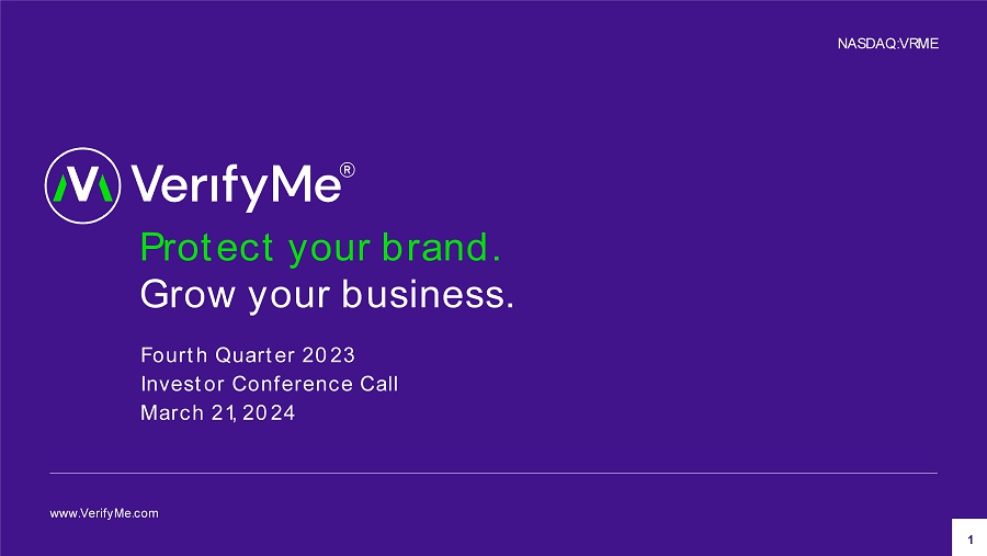 Protect your brand. Grow your business. Fourth Quarter 2023 Investor Conference Call March 21, 2024 www.VerifyMe.com NASDAQ:VRME 1