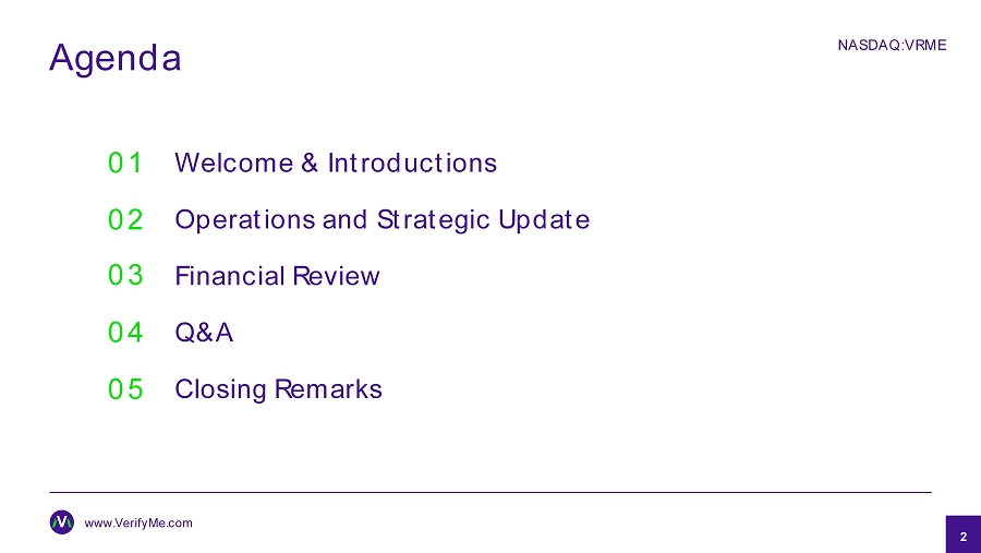 Agenda NASDAQ:VRME 01 Welcome & Introductions Operations and Strategic Update Financial Review Q&A Closing Remarks 02 03 www.VerifyMe.com 04 05 2