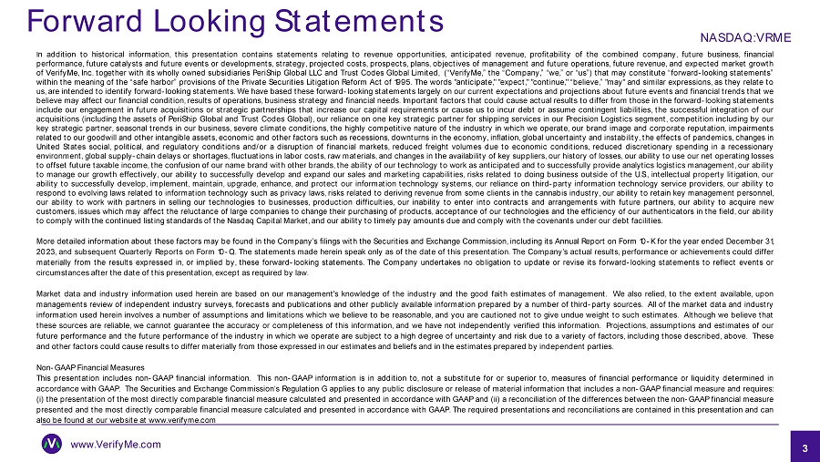 Forward Looking Statements I n addition to historical information, this presentation contains statements relating to revenue opportunities, anticipated revenue, profitability of the combined company, future business, financial performance, future catalysts and future events or developments, strategy, projected costs, prospects, plans, objectives of management and future operations, future revenue, and expected market growth of VerifyMe, Inc . together with its wholly owned subsidiaries PeriShip Global LLC and Trust Codes Global Limited, (“VerifyMe,” the “Company,” “we,” or “us”) that may constitute “forward - looking statements” within the meaning of the “safe harbor” provisions of the Private Securities Litigation Reform Act of 1995 . The words "anticipate," "expect," "continue," “believe,” "may" and similar expressions, as they relate to us, are intended to identify forward - looking statements . We have based these forward - looking statements largely on our current expectations and projections about future events and financial trends that we believe may affect our financial condition, results of operations, business strategy and financial needs . Important factors that could cause actual results to differ from those in the forward - looking statements include our engagement in future acquisitions or strategic partnerships that increase our capital requirements or cause us to incur debt or assume contingent liabilities, the successful integration of our acquisitions (including the assets of PeriShip Global and Trust Codes Global), our reliance on one key strategic partner for shipping services in our Precision Logistics segment, competition including by our key strategic partner, seasonal trends in our business, severe climate conditions, the highly competitive nature of the industry in which we operate, our brand image and corporate reputation, impairments related to our goodwill and other intangible assets, economic and other factors such as recessions, downturns in the economy, inflation, global uncertainty and instability, the effects of pandemics, changes in United States social, political, and regulatory conditions and/or a disruption of financial markets, reduced freight volumes due to economic conditions, reduced discretionary spending in a recessionary environment, global supply - chain delays or shortages, fluctuations in labor costs, raw materials, and changes in the availability of key suppliers, our history of losses, our ability to use our net operating losses to offset future taxable income, the confusion of our name brand with other brands, the ability of our technology to work as anticipated and to successfully provide analytics logistics management, our ability to manage our growth effectively, our ability to successfully develop and expand our sales and marketing capabilities, risks related to doing business outside of the U . S . , intellectual property litigation, our ability to successfully develop, implement, maintain, upgrade, enhance, and protect our information technology systems, our reliance on third - party information technology service providers, our ability to respond to evolving laws related to information technology such as privacy laws, risks related to deriving revenue from some clients in the cannabis industry, our ability to retain key management personnel, our ability to work with partners in selling our technologies to businesses, production difficulties, our inability to enter into contracts and arrangements with future partners, our ability to acquire new customers, issues which may affect the reluctance of large companies to change their purchasing of products, acceptance of our technologies and the efficiency of our authenticators in the field, our ability to comply with the continued listing standards of the Nasdaq Capital Market, and our ability to timely pay amounts due and comply with the covenants under our debt facilities . More detailed information about these factors may be found in the Company’s filings with the Securities and Exchange Commission, including its Annual Report on Form 10 - K for the year ended December 31 , 2023 , and subsequent Quarterly Reports on Form 10 - Q . The statements made herein speak only as of the date of this presentation . The Company’s actual results, performance or achievements could differ materially from the results expressed in, or implied by, these forward - looking statements . The Company undertakes no obligation to update or revise its forward - looking statements to reflect events or circumstances after the date of this presentation, except as required by law . Market data and industry information used herein are based on our management's knowledge of the industry and the good faith estimates of management . We also relied, to the extent available, upon managements review of independent industry surveys, forecasts and publications and other publicly available information prepared by a number of third - party sources . All of the market data and industry information used herein involves a number of assumptions and limitations which we believe to be reasonable, and you are cautioned not to give undue weight to such estimates . Although we believe that these sources are reliable, we cannot guarantee the accuracy or completeness of this information, and we have not independently verified this information . Projections, assumptions and estimates of our future performance and the future performance of the industry in which we operate are subject to a high degree of uncertainty and risk due to a variety of factors, including those described, above . These and other factors could cause results to differ materially from those expressed in our estimates and beliefs and in the estimates prepared by independent parties . Non - GAAP Financial Measures This presentation includes non - GAAP financial information . This non - GAAP information is in addition to, not a substitute