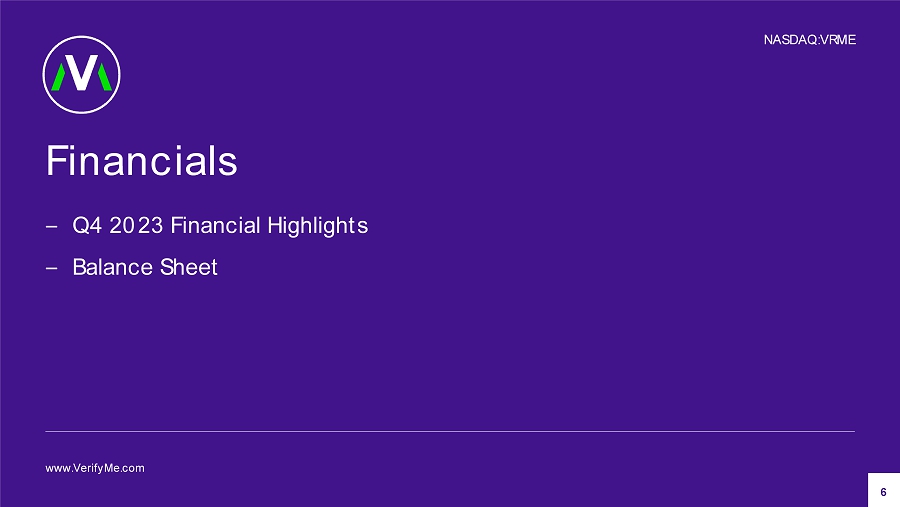 Financials www.VerifyMe.com NASDAQ:VRME – Q4 2023 Financial Highlights – Balance Sheet 6