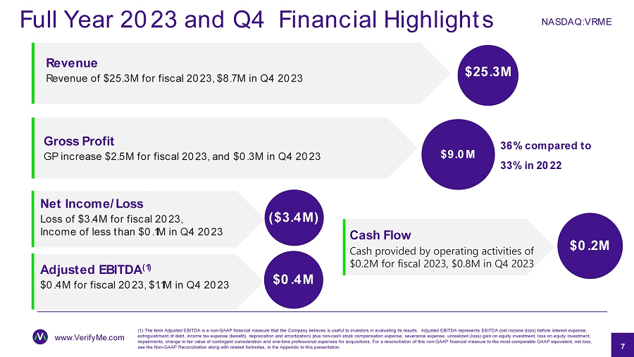 Performance 1 • Positive Adjusted EBITDA (1) for 2023 fiscal year • Revenue of $25.3M for 2023 fiscal year • Double - digit revenue growth in 2024 with H2 growth rate exceeding H1 growth rate Capital • Total cash net of current maturities of long - term debt end of December 2023 of $2.6M • Positive cashflow expected for 2024 • Leaving buy - back plan in place and continually reviewing strategy Precision Logistics • $8.6M Q4 and $24.6M fiscal year (Proforma fiscal year 2022 revenue $24M) • Gross margin 29% in Q1 2023 and averaged 36% across Q2 - Q4 2023 3 2 Strategic Snapshot 5 www.VerifyMe.com NASDAQ:VRME 4 Authentication • $0.2M revenue in Q4 2023 • Key updates • APAC business conditions continue to improve from 2023 • Manuka Health Integrated into Amazon Transparency • Added three sales associates (1) The term Adjusted EBITDA is a non - GAAP financial measure that the Company believes is useful to investors in evaluating its results. Adjusted EBITDA represents EBITDA (net income (loss) before interest expense, extinguishment of debt, income tax expense (benefit), depreciation and amortization) plus non - cash stock compensation expense, s everance expense, unrealized (loss) gain on equity investment, loss on equity investment, impairment of intangibles, change in fair value of contingent consideration and one - time professional expenses for acquisitions. For a reconciliation of this non - GAAP financial measure to the most comparable GAAP equivalent, net loss, see the Non - GAAP Reconciliation along with related footnotes, in the Appendix to this presentation.