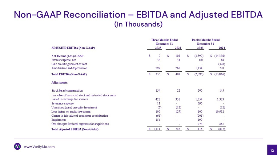 11 www.VerifyMe.com Non - GAAP Reconciliation This presentation includes both financial measures in accordance with U . S . generally accepted accounting principles (“GAAP”), as well as non - GAAP financial measures . Generally, a non - GAAP financial measure is a numerical measure of a company’s performance, financial position or cash flows that either excludes or includes amounts that are not normally included or excluded in the most directly comparable measure calculated and presented in accordance with GAAP . Non - GAAP financial measures should be viewed as supplemental to and should not be considered as alternatives to any other GAAP financial measures . They may not be indicative of the historical operating results of VerifyMe nor are they intended to be predictive of potential future results . Investors should not consider non - GAAP financial measures in isolation or as substitutes for performance measures calculated in accordance with GAAP . VerifyMe’s management uses and relies on EBITDA and Adjusted EBITDA, which are non - GAAP financial measures . The Company believes that both management and shareholders benefit from referring to EBITDA and Adjusted EBITDA in planning, forecasting and analyzing future periods . Additionally, the Company believes Adjusted EBIDTA is useful to investors to evaluate its results because it excludes certain items that are not directly related to the Company’s core operating performance . In particular, with regard to our comparison of Adjusted EBITDA for the three and twelve months ended December 31 , 2023 to the three and twelve months ended December 31 , 2022 , we believe that certain charges make a three and twelve month to three and twelve month comparison of net loss less useful to investors than a comparison of Adjusted EBITDA in understanding the results of operations . The Company’s management uses these non - GAAP financial measures in evaluating its financial and operational decision making and as a means to evaluate period - to - period comparison . The Company’s management recognizes that EBITDA and Adjusted EBITDA, as non - GAAP financial measures, have inherent limitations because of the described excluded items . The Company defines EBITDA as net income (loss) before interest expense, extinguishment of debt, income tax expense (benefit), and depreciation and amortization . Adjusted EBITDA represents EBITDA plus non - cash stock compensation expense, severance expense, unrealized (loss) gain on equity investment, loss on equity investment, impairments, change in fair value of contingent consideration and one - time professional expenses for acquisitions . VerifyMe believes EBITDA and Adjusted EBITDA are important measures of VerifyMe’s operating performance because they allow management, investors and analysts to evaluate and assess VerifyMe’s core operating results from period - to - period after removing the impact of items of a non - operational nature that affect comparability . A reconciliation of EBITDA and Adjusted EBITDA to the most comparable financial measure, net income (loss), calculated in accordance with GAAP is included in the table on the next slide . The Company believes that providing the non - GAAP financial measures, together with the reconciliation to GAAP, helps investors make comparisons between VerifyMe and other companies . In making any comparisons to other companies, investors need to be aware that companies use different non - GAAP measures to evaluate their financial performance . Investors should pay close attention to the specific definition being used and to the reconciliation between such measure and the corresponding GAAP measure provided by each company under applicable SEC rules as the presentation here may not be comparable to other similarly titled measures of other companies .