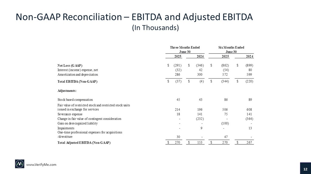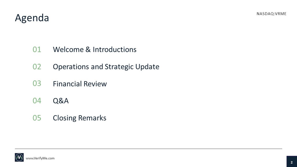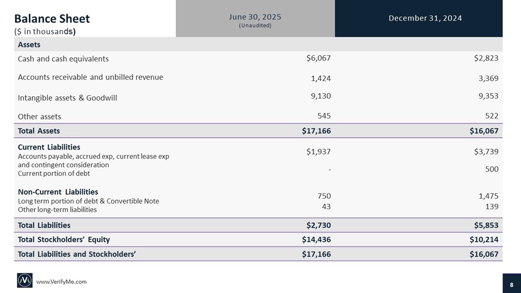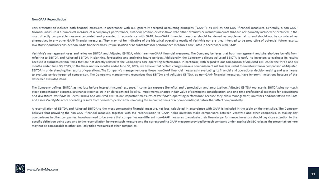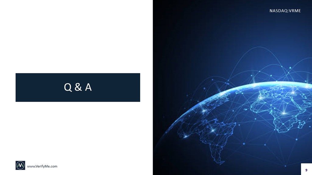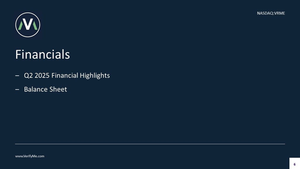 当社は、2025年8月13日(水)午前11時(米国東部時間)に決算電話会議とウェブキャストを予定しています。ベリファイの財務および経営成績に関する準備された発言に続き、ベリファイの経営陣との質疑応答の時間が設けられます。この電話会議には、ウェブキャスト(https://event.choruscall.com/mediaframe/webcast.html?webcastid=YmPT1jph)、または米国内は+1 (844) 763-8274、海外は+1 (412) 717-9224に電話し、"VerifyMe Call "とリクエストすることでアクセスできます。ウェブキャストで放送されるプレゼンテーションスライドは、当日の朝、VerifyMeウェブサイトの投資家セクションでもご覧いただけます。コール中に経営陣に質問を提出するには、参加者は電話でログインしていなければなりません。参加者は、電話会議とウェブキャストへの事前登録が可能です: https://dpregister.com/sreg/10201806/ffaa27b28a.