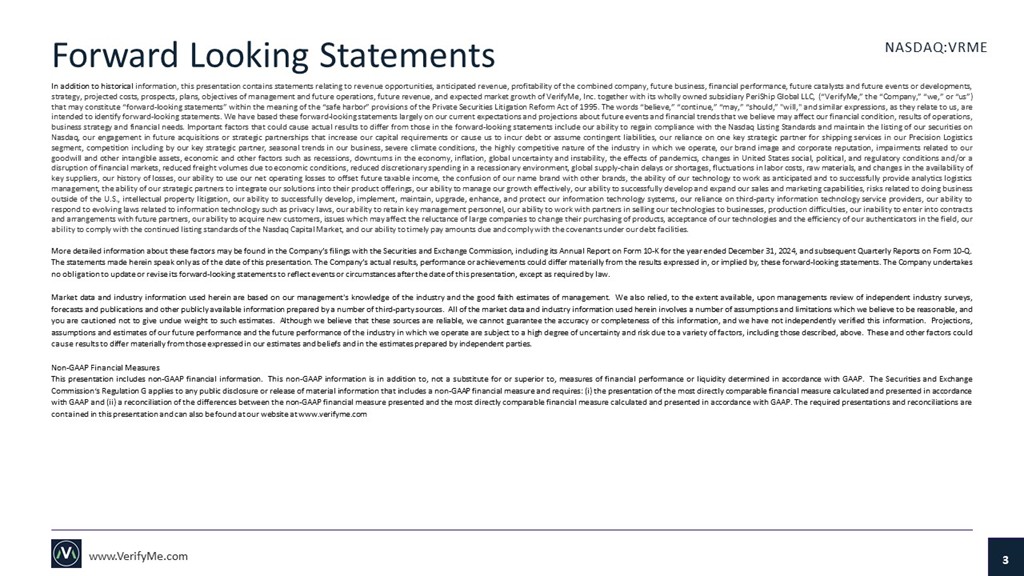 本リリースには、1995年米国私募証券訴訟改革法(Private Securities Litigation Reform Act of 1995)で定義される意味での、将来の見通しに関する記述が含まれています。当社に関する「確信する」、「継続する」、「可能性がある」、「はずである」、「予定である」および同様の表現は、将来見通しに関する記述を特定するためのものです。これらの将来予想に関する記述は、当社の財務状況、経営成績、事業戦略および財務上の必要性に影響を及ぼす可能性があると考えられる将来の出来事および財務動向に関する当社の現在の予想および予測に大きく基づいています。実際の業績が記述内容と異なる可能性がある重要な要因には、当社の資本要件を増加させ、または負債もしくは偶発債務を引き受ける原因となる将来の買収または戦略的提携への関与、精密物流事業における輸送サービスにおける1社の主要戦略パートナーへの依存、主要戦略パートナーを含む競争、当社の事業における季節的動向などがあります、厳しい気候条件、当社が事業を展開する業界の競争の激しさ、当社のブランドイメージや企業評判、のれんやその他の無形資産に関連する減損、景気後退、景気悪化、インフレ、世界的な不確実性や不安定性、パンデミックの影響、米国の社会・政治・規制状況の変化、金融市場の混乱などの経済的要因やその他の要因、経済情勢による貨物量の減少、不況環境における裁量支出の減少、世界的なサプライチェーンの遅延や不足、人件費や原材料の変動、主要サプライヤーの供給状況の変化、当社の過去の損失歴、将来の課税所得を相殺するための正味営業損失の使用能力、当社ブランドと他のブランドとの混同、当社の技術が期待通りに機能し、アナリティクス・ロジスティクス・マネジメントを成功裏に提供する能力、当社のAuthentication部門の開発と商業化に投資を継続する能力、当社の戦略的パートナーが当社のソリューションを自社の製品に統合する能力、当社の成長を効果的に管理する能力、当社の営業・マーケティング能力を成功裏に開発・拡大する能力、米国外での事業展開に関連するリスク。S.,知的財産権訴訟、情報技術システムの開発、導入、維持、アップグレード、強化、保護を成功させる当社の能力、第三者の情報技術サービス・プロバイダーへの依存、プライバシー法など情報技術に関連する法律の進化に対応する当社の能力、経営陣の後継者を惹きつけ、維持し、育成する当社の能力、当社の技術を企業に販売する際にパートナーと協力する当社の能力、生産上の困難、将来のパートナーとの契約や取り決めを締結する当社の能力、新規顧客を獲得する当社の能力、大企業の製品購入の変更に消極的な姿勢に影響を与える可能性のある問題、当社の技術や現場での認証機の効率性の受け入れ、ナスダック資本市場の上場基準を継続的に遵守する当社の能力、債務施設の支払期日を適時に支払い、約款を遵守する当社の能力。これらのリスク要因や不確実性には、ベリファイの年次報告書および証券取引委員会に提出された四半期報告書("リスク要因 "と題された見出しを含む)に詳述されているものが含まれます。これらのリスクや不確実性が1つ以上顕在化した場合、または当社の基本的な仮定が正しくないと判明した場合、実際の結果は、現在予想されているものと大きく異なる可能性があります。ここに記載されている当社の将来の見通しに関する記述は、それが作成された時点のものです。当社の実際の業績と異なる可能性のある要因や事象は随時現れる可能性があり、そのすべてを予測することは不可能です。当社は、法律で義務付けられている場合を除き、新たな情報、将来の進展、またはその他の結果にかかわらず、いかなる将来予想に関する記述も公に更新する義務を負いません。