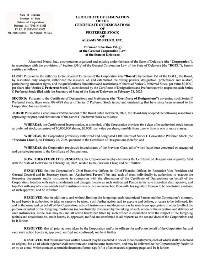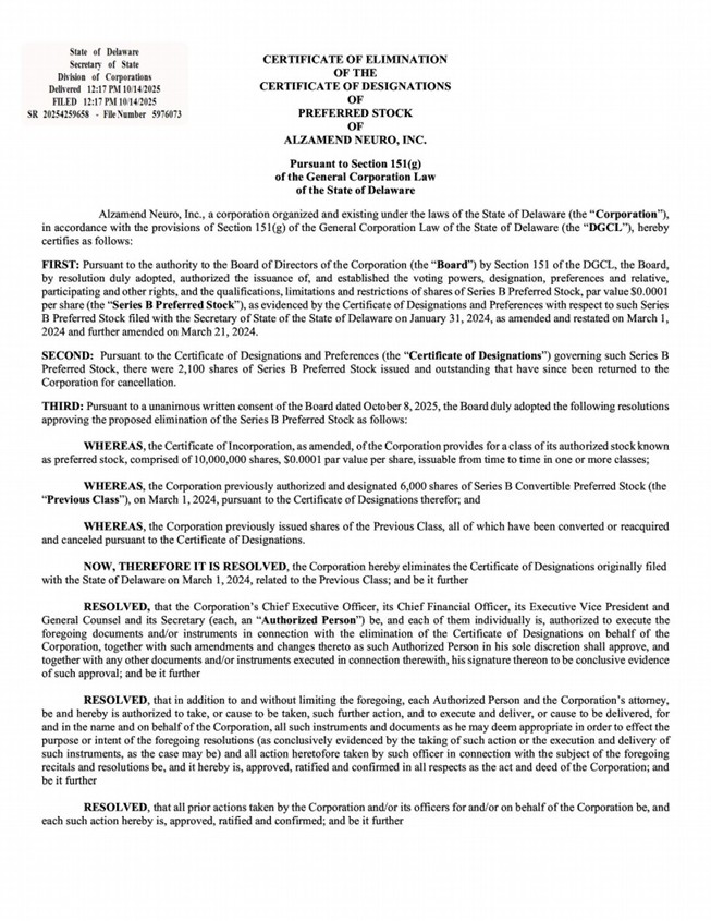 Delaware The First State Page 1 5976073 8100 Authentication: 205032427 SR# 20254259658 Date: 10-14-25 You may verify this certificate online at corp.delaware.gov/authver.shtml I, CHARUNI PATIBANDA-SANCHEZ, SECRETARY OF STATE OF THE STATE OF DELAWARE, DO HEREBY CERTIFY THE ATTACHED IS A TRUE AND CORRECT COPY OF THE CERTIFICATE OF DESIGNATION OF “ALZAMEND NEURO, INC.”, FILED IN THIS OFFICE ON THE FOURTEENTH DAY OF OCTOBER, A.D. 2025, AT 12:17 O`CLOCK P.M. State of Delaware Secretary of State Division of Corporations Delivered 12:17 PM 10/14/2025 FILED 12:17 PM 10/14/2025 SR 20254259658 - File Number 5976073 CERTIFICATE OF ELIMINATION OFTHE CERTIFICATE OF DESIGNATIONS OF PREFERRED STOCK OF ALZAMEND NEURO, INC. Pursuant to Section 15l(g) of the General Corporation Law of the State of Delaware Alzamend Neuro, Inc., a corporation organized and existing under the laws of the State of Delaware (the "Corporation"), in accordance with the provisions of Section 151 (g) of the General Corporation Law of the State of Delaware ( the "DGCL"), hereby certifies as follows: FIRST: Pursuant to the authority to the Board of Directors of the Corporation (the "Board") by Section 151 of the DGCL, the Board, by resolution duly adopted, authorized the issuance of, and established the voting powers, designation, preferences and relative, participating and other rights, and the qualifications, limitations and restrictions of shares of Series B Preferred Stock, par value $0.0001 per share (the "Series B Preferred Stock"), as evidenced by the Certificate of Designations and Preferences with respect to such Series B Preferred Stock filed with the Secretary of State of the State of Delaware on January 31, 2024, as amended and restated on March 1, 2024 and further amended on March 21, 2024. SECOND: Pursuant to the Certificate of Designations and Preferences (the "Certificate of Designations") governing such Series B Preferred Stock, there were 2,100 shares of Series B Preferred Stock issued and outstanding that have since been returned to the Corporation for cancellation. THIRD: Pursuant to a unanimous written consent of the Board dated October 8, 2025, the Board duly adopted the following resolutions approving the proposed elimination of the Series B Preferred Stock as follows: WHEREAS, the Certificate of Incorporation, as amended, of the Corporation provides for a class of its authorized stock known as preferred stock, comprised of 10,000,000 shares, $0.0001 par value per share, issuable from time to time in one or more classes; WHEREAS, the Corporation previously authorized and designated 6,000 shares of Series B Convertible Preferred Stock (the "Previous Class"), on March 1, 2024, pursuant to the Certificate of Designations therefor; and WHEREAS, the Corporation previously issued shares of the Previous Class, all of which have been converted or reacquired and canceled pursuant to the Certificate of Designations. NOW, THERE.FORE IT IS RESOLVED, the Corporation hereby eliminates the Certificate of Designations originally filed with the State of Delaware on March 1, 2024, related to the Previous Class; and be it further RESOLVED, that the Corporation's Chief Executive Officer, its Chief Financial Officer, its Executive Vice President and General Counsel and its Secretary ( each, an "Authorized Person") be, and each of them individually is, authorized to execute the foregoing documents and/or instruments in connection with the elimination of the Certificate of Designations on behalf of the Corporation, together with such amendments and changes thereto as such Authorized Person in his sole discretion shall approve, and together with any other documents and/or instruments executed in connection therewith, his signature thereon to be conclusive evidence of such approval; and be it further RESOLVED, that in addition to and without limiting the foregoing, each Authorized Person and the Corporation's attorney, be and hereby is authorized to take, or cause to be taken, such further action, and to execute and deliver, or cause to be delivered, for and in the nam.e and on behalf of the Corporation, all such instruments and documents as he may deem appropriate in order to effect the purpose or intent of the foregoing resolutions (as conclusively evidenced by the taking of such action or the execution and delivery of such instruments, as the case may be) and all action heretofore taken by such officer in connection with the subject of the foregoing recitals and resolutions be, and it hereby is, approved, ratified and confirmed in all respects as the act and deed of the Corporation; and be it further RESOLVED, that all prior actions taken by the Corporation and/or its officers for and/or on behalf of the Corporation be, and each such action hereby is, approved, ratified and confirmed; and be it further RESOLVED, that this unanimous written consent may be executed in one or more counterparts, each of which shall be deemed an original, but all of which together shall constitute one and the same instrument, and may be delivered to the Corporation by facsimile or by an e-mail which contains a portable document format (. pdf) file of an executed signature page; and be it further RESOLVED, that the Secretary or any Assistant Secretary or any other officer of this Corporation be, and hereby is, authorized to certify as to the adoption of any or all of the foregoing resolutions. FOURTH: In accordance with Section l5l(g) of the DGCL, the shares that were designated as Series B Preferred Stock are hereby returned to the status of authorized but unissued shares of the Preferred Stock of the Corporation, without designation as to series. IN WITNESS WHEREOF, the Corporation has caused this Certificate of Elimination to be signed by its duly authorized officer on the 14th day of October, 2025. ALZAMEND NEURO, INC.