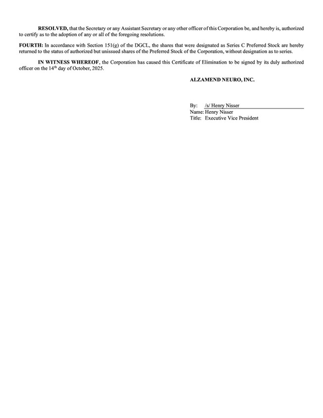 By: /s/ Henry Nisser Name: Henry Nisser Title: Executive Vice President Delaware The First State Page 1 5976073 8100 Authentication: 205032822 SR# 20254259960 Date: 10-14-25 You may verify this certificate online at corp.delaware.gov/authver.shtml I, CHARUNI PATIBANDA-SANCHEZ, SECRETARY OF STATE OF THE STATE OF DELAWARE, DO HEREBY CERTIFY THE ATTACHED IS A TRUE AND CORRECT COPY OF THE CERTIFICATE OF DESIGNATION OF “ALZAMEND NEURO, INC.”, FILED IN THIS OFFICE ON THE FOURTEENTH DAY OF OCTOBER, A.D. 2025, AT 12:18 O`CLOCK P.M. State of Delaware Secretary of State Division of Corporations Delivered 12:17 PM 10/14/2025 FILED 12:18 PM 10/14/2025 SR 20254259960 - File Number 5976073 CERTIFICATE OF ELIMINATION OFTHE CERTIFICATE OF DESIGNATIONS OF PREFERRED STOCK OF ALZAMEND NEURO, INC. Pursuant to Section 15l(g) of the General Corporation Law of the State of Delaware Alzamend Neuro, Inc., a corporation organized and existing under the laws of the State of Delaware (the "Corporation"), in accordance with the provisions of Section 151 (g) of the General Corporation Law of the State of Delaware ( the "DGCL"), hereby certifies as follows: FIRST: Pursuant to the authority to the Board of Directors of the Corporation (the "Board") by Section I 51 of the DGCL, the Board, by resolution duly adopted, authorized the issuance of, and established the voting powers, designation, preferences and relative, participating and other rights, and the qualifications, limitations and restrictions of shares of Series C Preferred Stock, par value $0.0001 per share (the "Series C Preferred Stock"), as evidenced by the Certificate of Designations and Preferences with respect to such Series C Preferred Stock filed with the Secretary of State of the State of Delaware on February 28, 2025. SECOND: Pursuant to the Certificate of Designations and Preferences (the "Certificate of Designations") governing such Series C Preferred Stock, there were 599.6888 shares of Series C Preferred Stock issued and outstanding that have since been returned to the Corporation for cancellation. THIRD: Pursuant to a unanimous written consent of the Board dated October 8, 2025, the Board duly adopted the following resolutions approving the proposed elimination of the Series C Preferred Stock as follows: WHEREAS, the Certificate of Incorporation, as amended, of the Corporation provides for a class of its authorized stock known as preferred stock, comprised of I 0,000,000 shares, $0.0001 par value per share, issuable from time to time in one or more classes; WHEREAS, the Corporation previously authorized and designated 1,000 shares of Series C Convertible Preferred Stock (the "Previous Class"), on February 28, 2025, pursuant to the Certificate of Designations therefor; and WHEREAS, the Corporation previously issued shares of the Previous Class, all of which have been converted or reacquired and canceled pursuant to the Certificate of Designations. NOW, THEREFORE IT IS RESOLVED, the Corporation hereby eliminates the Certificate of Designations originally filed with the State of Delaware on February 28, 2025, related to the Previous Class; and be it further RESOLVED, that the Corporation's Chief Executive Officer, its Chief Financial Officer, its Executive Vice President and General Counsel and its Secretary ( each, an "Authorized Person") be, and each of them individually is, authorized to execute the foregoing documents and/or instruments in connection with the elimination of the Certificate of Designations on behalf of the Corporation, together with such amendments and changes thereto as such Authorized Person in his sole discretion shall approve, and together with any other documents and/or instruments executed in connection therewith, his signature thereon to be conclusive evidence of such approval; and be it further RESOLVED, that in addition to and without limiting the foregoing, each Authorized Person and the Corporation's attorney, be and hereby is authorized to take, or cause to be taken, such further action, and to execute and deliver, or cause to be delivered, for and in the name and on behalf of the Corporation, all such instruments and documents as he may deem appropriate in order to effect the purpose or intent of the foregoing resolutions (as conclusively evidenced by the taking of such action or the execution and delivery of such instruments, as the case may be) and all action heretofore taken by such officer in connection with the subject of the foregoing recitals and resolutions be, and it hereby is, approved, ratified and confirmed in all respects as the act and deed of the Corporation; and be it further RESOLVED, that all prior actions taken by the Corporation and/or its officers for and/or on behalf of the Corporation be, and each such action hereby is, approved, ratified and confirmed; and be it further RESOLVED, that this unanimous written consent may be executed in one or more counterparts, each of which shall be deemed an original, but all of which together shall constitute one and the same instrument, and may be delivered to the Corporation by facsimile or by an e-mail which contains a portable document format (.pdf) file of an executed signature page; and be it further RESOLVED, that the Secretary or any Assistant Secretary or any other officer of this Corporation be, and hereby is, authorized to certify as to the adoption of any or all of the foregoing resolutions. FOURTH: In accordance with Section 151 (g) of the DGCL, the shares that were designated as Series C Preferred Stock are hereby returned to the status of authorized but unissued shares of the Preferred Stock of the Corporation, without designation as to series. IN WITNESS WHEREOF, the Corporation has caused this Certificate of Elimination to be signed by its duly authorized officer on the 14th day of October, 2025. ALZAMEND NEURO, INC. By: /s/ Henry Nisser Name: Henry Nisser Title: Executive Vice President