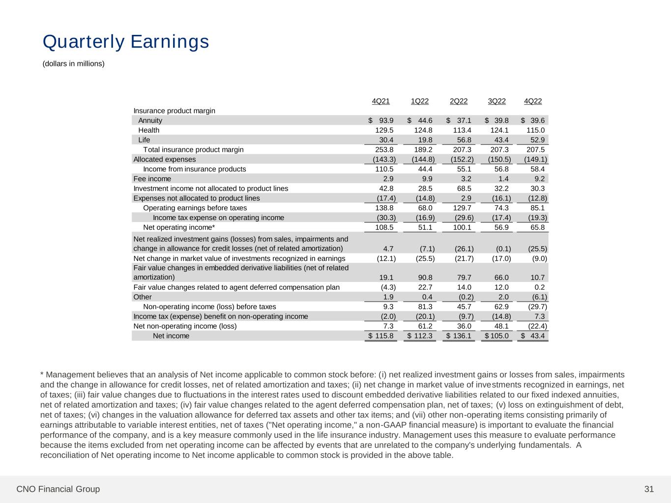 | Total investment income allocated to annuities | 115.7 | 114.9 | 115.5 | 116.3 | 462.4 | 115.1 | 114.8 | 117.3 | 119.6 | 466.8 | ||||||||||||||||||||||||||||||||||||||||||||||||||||