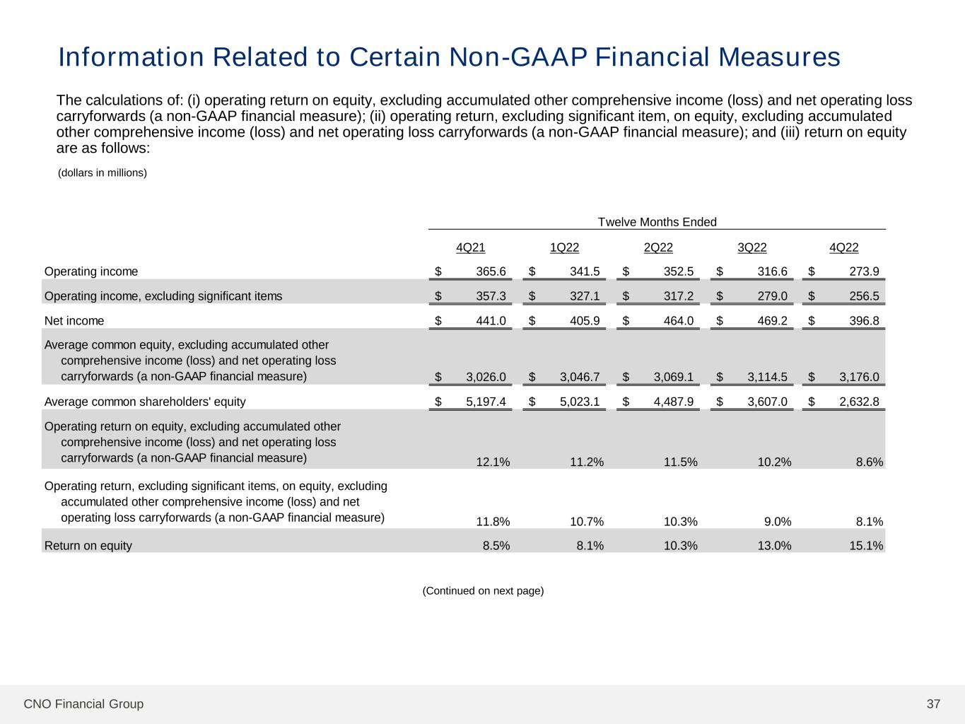 | Trailing twelve months operating return, excluding significant items, on equity, excluding accumulated other comprehensive income (loss) and net operating loss carryforwards (a non-GAAP financial measure) (6) | 8.1 | % | 11.8 | % | |||||||