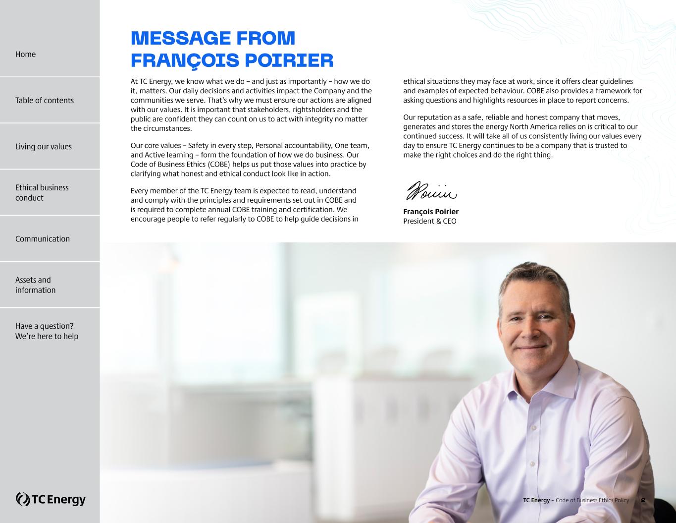 MESSAGE FROM FRANÇOIS POIRIER At TC Energy, we know what we do – and just as importantly – how we do it, matters. Our daily decisions and activities impact the Company and the communities we serve. That’s why we must ensure our actions are aligned with our values. It is important that stakeholders, rightsholders and the public are confident they can count on us to act with integrity no matter the circumstances. Our core values – Safety in every step, Personal accountability, One team, and Active learning – form the foundation of how we do business. Our Code of Business Ethics (COBE) helps us put those values into practice by clarifying what honest and ethical conduct look like in action. Every member of the TC Energy team is expected to read, understand and comply with the principles and requirements set out in COBE and is required to complete annual COBE training and certification. We encourage people to refer regularly to COBE to help guide decisions in ethical situations they may face at work, since it offers clear guidelines and examples of expected behaviour. COBE also provides a framework for asking questions and highlights resources in place to report concerns. Our reputation as a safe, reliable and honest company that moves, generates and stores the energy North America relies on is critical to our continued success. It will take all of us consistently living our values every day to ensure TC Energy continues to be a company that is trusted to make the right choices and do the right thing. François Poirier President & CEO TC Energy – Code of Business Ethics Policy 2 Home Living our values Ethical business conduct Communication Assets and information Have a question? We’re here to help Table of contents