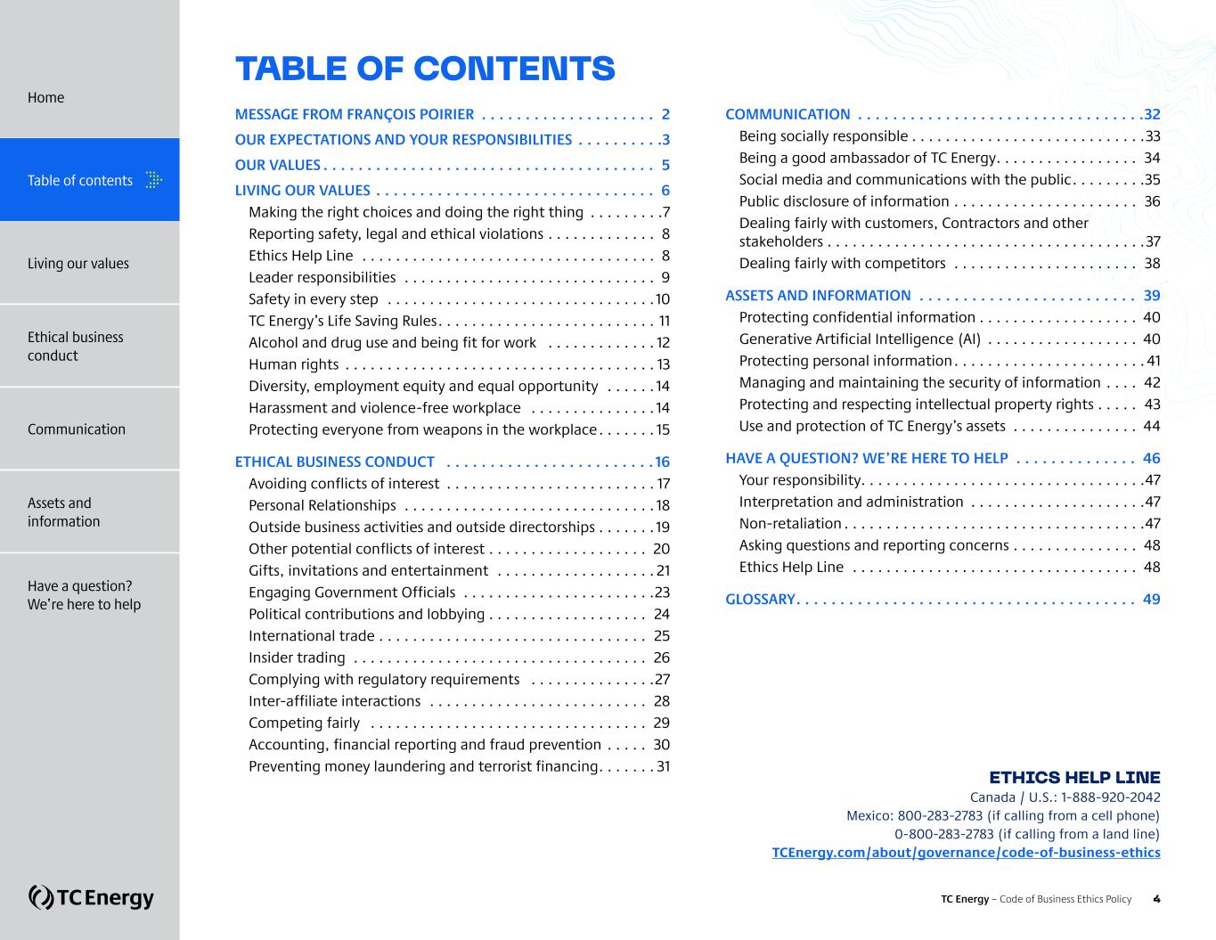 TABLE OF CONTENTS MESSAGE FROM FRANÇOIS POIRIER . . . . . . . . . . . . . . . . . . . . 2 OUR EXPECTATIONS AND YOUR RESPONSIBILITIES . . . . . . . . . .3 OUR VALUES . . . . . . . . . . . . . . . . . . . . . . . . . . . . . . . . . . . . . . 5 LIVING OUR VALUES . . . . . . . . . . . . . . . . . . . . . . . . . . . . . . . . 6 Making the right choices and doing the right thing . . . . . . . . .7 Reporting safety, legal and ethical violations . . . . . . . . . . . . . 8 Ethics Help Line . . . . . . . . . . . . . . . . . . . . . . . . . . . . . . . . . . . 8 Leader responsibilities . . . . . . . . . . . . . . . . . . . . . . . . . . . . . . 9 Safety in every step . . . . . . . . . . . . . . . . . . . . . . . . . . . . . . . .10 TC Energy’s Life Saving Rules . . . . . . . . . . . . . . . . . . . . . . . . . . 11 Alcohol and drug use and being fit for work . . . . . . . . . . . . . 12 Human rights . . . . . . . . . . . . . . . . . . . . . . . . . . . . . . . . . . . . . 13 Diversity, employment equity and equal opportunity . . . . . . 14 Harassment and violence-free workplace . . . . . . . . . . . . . . . 14 Protecting everyone from weapons in the workplace . . . . . . . 15 ETHICAL BUSINESS CONDUCT . . . . . . . . . . . . . . . . . . . . . . . .16 Avoiding conflicts of interest . . . . . . . . . . . . . . . . . . . . . . . . . 17 Personal Relationships . . . . . . . . . . . . . . . . . . . . . . . . . . . . . . 18 Outside business activities and outside directorships . . . . . . .19 Other potential conflicts of interest . . . . . . . . . . . . . . . . . . . 20 Gifts, invitations and entertainment . . . . . . . . . . . . . . . . . . . 21 Engaging Government Officials . . . . . . . . . . . . . . . . . . . . . . .23 Political contributions and lobbying . . . . . . . . . . . . . . . . . . . 24 International trade . . . . . . . . . . . . . . . . . . . . . . . . . . . . . . . . 25 Insider trading . . . . . . . . . . . . . . . . . . . . . . . . . . . . . . . . . . . 26 Complying with regulatory requirements . . . . . . . . . . . . . . .27 Inter-affiliate interactions . . . . . . . . . . . . . . . . . . . . . . . . . . 28 Competing fairly . . . . . . . . . . . . . . . . . . . . . . . . . . . . . . . . . 29 Accounting, financial reporting and fraud prevention . . . . . 30 Preventing money laundering and terrorist financing . . . . . . . 31 COMMUNICATION . . . . . . . . . . . . . . . . . . . . . . . . . . . . . . . . .32 Being socially responsible . . . . . . . . . . . . . . . . . . . . . . . . . . . .33 Being a good ambassador of TC Energy . . . . . . . . . . . . . . . . . 34 Social media and communications with the public . . . . . . . . .35 Public disclosure of information . . . . . . . . . . . . . . . . . . . . . . 36 Dealing fairly with customers, Contractors and other stakeholders . . . . . . . . . . . . . . . . . . . . . . . . . . . . . . . . . . . . . .37 Dealing fairly with competitors . . . . . . . . . . . . . . . . . . . . . . 38 ASSETS AND INFORMATION . . . . . . . . . . . . . . . . . . . . . . . . . 39 Protecting confidential information . . . . . . . . . . . . . . . . . . . 40 Generative Artificial Intelligence (AI) . . . . . . . . . . . . . . . . . . 40 Protecting personal information . . . . . . . . . . . . . . . . . . . . . . .41 Managing and maintaining the security of information . . . . 42 Protecting and respecting intellectual property rights . . . . . 43 Use and protection of TC Energy’s assets . . . . . . . . . . . . . . . 44 HAVE A QUESTION? WE’RE HERE TO HELP . . . . . . . . . . . . . . 46 Your responsibility. . . . . . . . . . . . . . . . . . . . . . . . . . . . . . . . . .47 Interpretation and administration . . . . . . . . . . . . . . . . . . . . .47 Non-retaliation . . . . . . . . . . . . . . . . . . . . . . . . . . . . . . . . . . . .47 Asking questions and reporting concerns . . . . . . . . . . . . . . . 48 Ethics Help Line . . . . . . . . . . . . . . . . . . . . . . . . . . . . . . . . . . 48 GLOSSARY . . . . . . . . . . . . . . . . . . . . . . . . . . . . . . . . . . . . . . . 49 ETHICS HELP LINE Canada / U.S.: 1-888-920-2042 Mexico: 800-283-2783 (if calling from a cell phone) 0-800-283-2783 (if calling from a land line) TCEnergy.com/about/governance/code-of-business-ethics Home Table of contents Living our values Ethical business conduct Communication Assets and information Have a question? We’re here to help TC Energy – Code of Business Ethics Policy 4