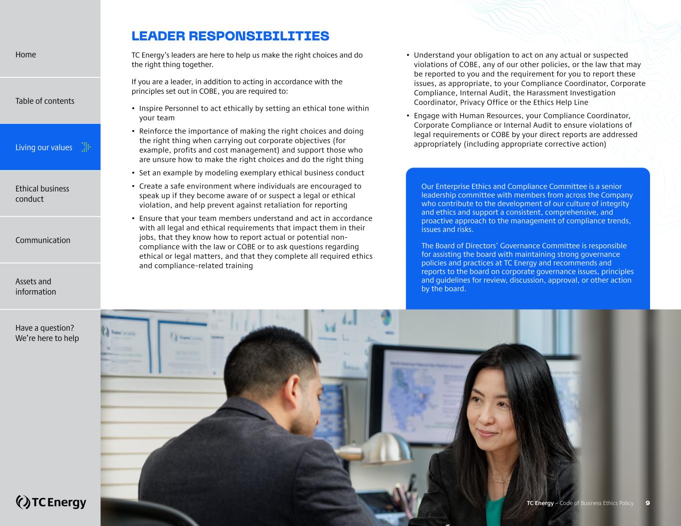 Our Enterprise Ethics and Compliance Committee is a senior leadership committee with members from across the Company who contribute to the development of our culture of integrity and ethics and support a consistent, comprehensive, and proactive approach to the management of compliance trends, issues and risks. The Board of Directors’ Governance Committee is responsible for assisting the board with maintaining strong governance policies and practices at TC Energy and recommends and reports to the board on corporate governance issues, principles and guidelines for review, discussion, approval, or other action by the board. LEADER RESPONSIBILITIES TC Energy’s leaders are here to help us make the right choices and do the right thing together. If you are a leader, in addition to acting in accordance with the principles set out in COBE, you are required to: • Inspire Personnel to act ethically by setting an ethical tone within your team • Reinforce the importance of making the right choices and doing the right thing when carrying out corporate objectives (for example, profits and cost management) and support those who are unsure how to make the right choices and do the right thing • Set an example by modeling exemplary ethical business conduct • Create a safe environment where individuals are encouraged to speak up if they become aware of or suspect a legal or ethical violation, and help prevent against retaliation for reporting • Ensure that your team members understand and act in accordance with all legal and ethical requirements that impact them in their jobs, that they know how to report actual or potential non- compliance with the law or COBE or to ask questions regarding ethical or legal matters, and that they complete all required ethics and compliance-related training • Understand your obligation to act on any actual or suspected violations of COBE, any of our other policies, or the law that may be reported to you and the requirement for you to report these issues, as appropriate, to your Compliance Coordinator, Corporate Compliance, Internal Audit, the Harassment Investigation Coordinator, Privacy Office or the Ethics Help Line • Engage with Human Resources, your Compliance Coordinator, Corporate Compliance or Internal Audit to ensure violations of legal requirements or COBE by your direct reports are addressed appropriately (including appropriate corrective action) TC Energy – Code of Business Ethics Policy 9 Home Table of contents Living our values Ethical business conduct Communication Assets and information Have a question? We’re here to help