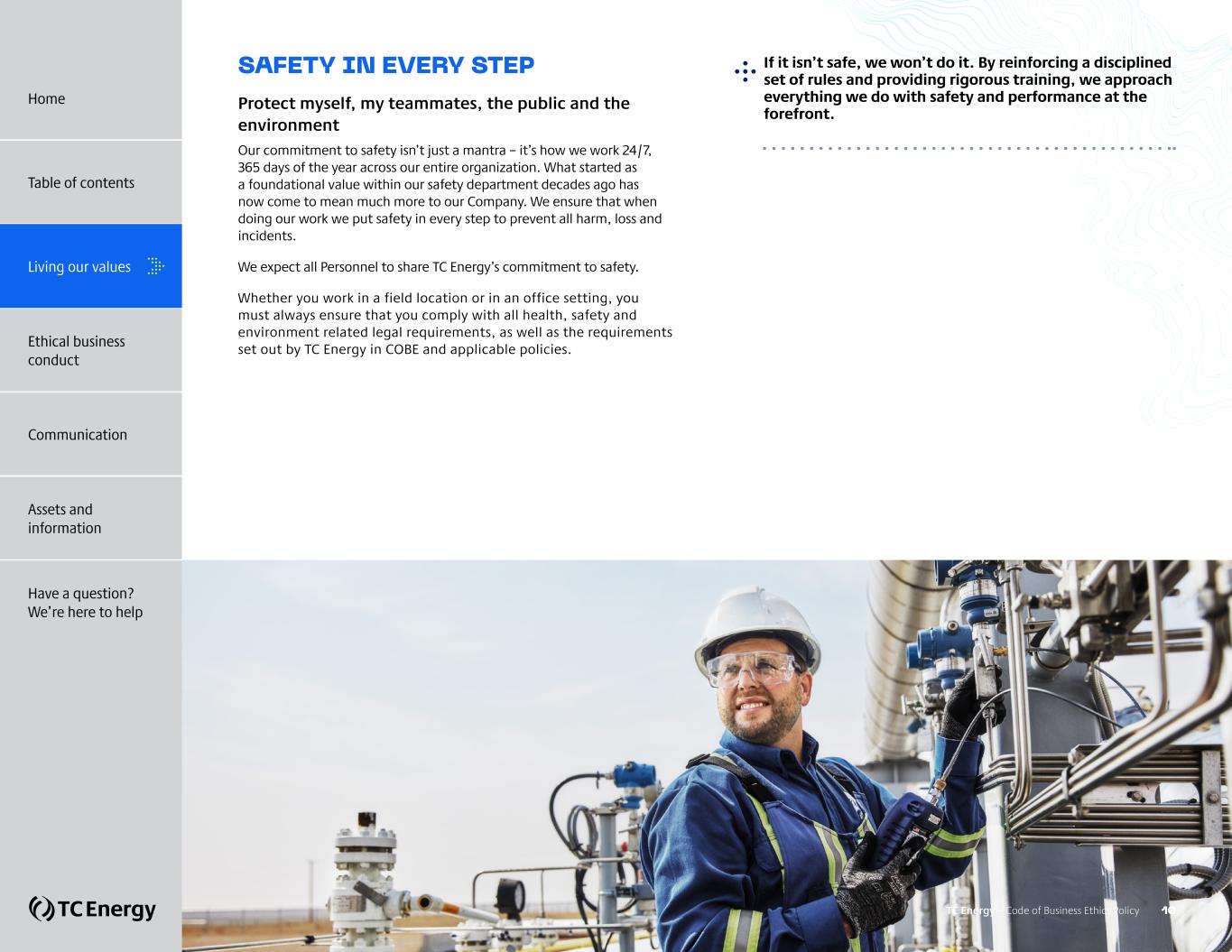 SAFETY IN EVERY STEP Protect myself, my teammates, the public and the environment Our commitment to safety isn’t just a mantra – it’s how we work 24/7, 365 days of the year across our entire organization. What started as a foundational value within our safety department decades ago has now come to mean much more to our Company. We ensure that when doing our work we put safety in every step to prevent all harm, loss and incidents. We expect all Personnel to share TC Energy’s commitment to safety. Whether you work in a field location or in an office setting, you must always ensure that you comply with all health, safety and environment related legal requirements, as well as the requirements set out by TC Energy in COBE and applicable policies. If it isn’t safe, we won’t do it. By reinforcing a disciplined set of rules and providing rigorous training, we approach everything we do with safety and performance at the forefront. TC Energy – Code of Business Ethics Policy 10 Home Table of contents Living our values Ethical business conduct Communication Assets and information Have a question? We’re here to help