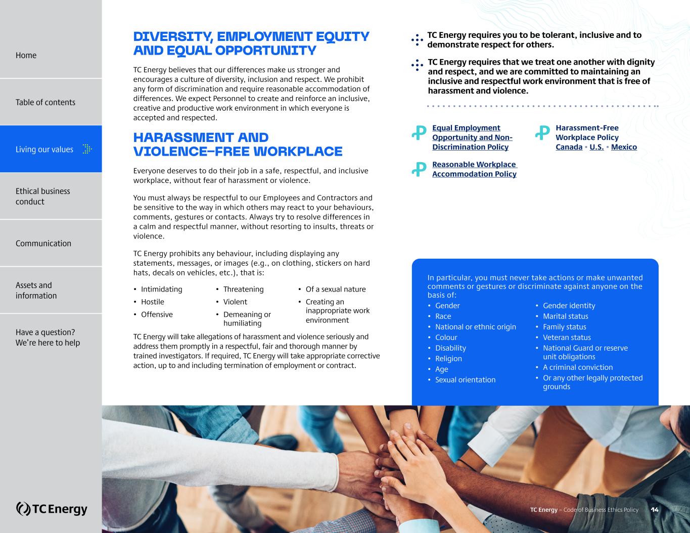 Ꝓ Equal Employment Opportunity and Non- Discrimination Policy Ꝓ Reasonable Workplace Accommodation Policy Ꝓ Harassment-Free Workplace Policy Canada • U.S. • Mexico TC Energy requires you to be tolerant, inclusive and to demonstrate respect for others. TC Energy requires that we treat one another with dignity and respect, and we are committed to maintaining an inclusive and respectful work environment that is free of harassment and violence. DIVERSITY, EMPLOYMENT EQUITY AND EQUAL OPPORTUNITY TC Energy believes that our differences make us stronger and encourages a culture of diversity, inclusion and respect. We prohibit any form of discrimination and require reasonable accommodation of differences. We expect Personnel to create and reinforce an inclusive, creative and productive work environment in which everyone is accepted and respected. HARASSMENT AND VIOLENCE-FREE WORKPLACE Everyone deserves to do their job in a safe, respectful, and inclusive workplace, without fear of harassment or violence. You must always be respectful to our Employees and Contractors and be sensitive to the way in which others may react to your behaviours, comments, gestures or contacts. Always try to resolve differences in a calm and respectful manner, without resorting to insults, threats or violence. TC Energy prohibits any behaviour, including displaying any statements, messages, or images (e.g., on clothing, stickers on hard hats, decals on vehicles, etc.), that is: • Intimidating • Hostile • Offensive • Threatening • Violent • Demeaning or humiliating • Of a sexual nature • Creating an inappropriate work environment TC Energy will take allegations of harassment and violence seriously and address them promptly in a respectful, fair and thorough manner by trained investigators. If required, TC Energy will take appropriate corrective action, up to and including termination of employment or contract. In particular, you must never take actions or make unwanted comments or gestures or discriminate against anyone on the basis of: • Gender • Race • National or ethnic origin • Colour • Disability • Religion • Age • Sexual orientation • Gender identity • Marital status • Family status • Veteran status • National Guard or reserve unit obligations • A criminal conviction • Or any other legally protected grounds TC Energy – Code of Business Ethics Policy 14 Home Table of contents Living our values Ethical business conduct Communication Assets and information Have a question? We’re here to help