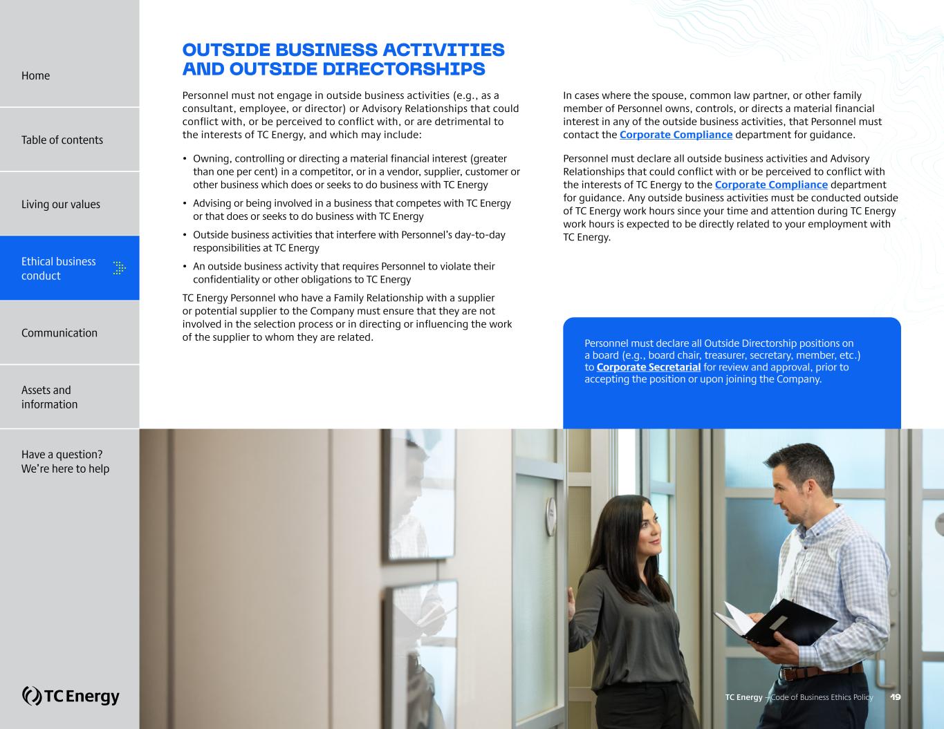 OUTSIDE BUSINESS ACTIVITIES AND OUTSIDE DIRECTORSHIPS Personnel must not engage in outside business activities (e.g., as a consultant, employee, or director) or Advisory Relationships that could conflict with, or be perceived to conflict with, or are detrimental to the interests of TC Energy, and which may include: • Owning, controlling or directing a material financial interest (greater than one per cent) in a competitor, or in a vendor, supplier, customer or other business which does or seeks to do business with TC Energy • Advising or being involved in a business that competes with TC Energy or that does or seeks to do business with TC Energy • Outside business activities that interfere with Personnel’s day-to-day responsibilities at TC Energy • An outside business activity that requires Personnel to violate their confidentiality or other obligations to TC Energy TC Energy Personnel who have a Family Relationship with a supplier or potential supplier to the Company must ensure that they are not involved in the selection process or in directing or influencing the work of the supplier to whom they are related. In cases where the spouse, common law partner, or other family member of Personnel owns, controls, or directs a material financial interest in any of the outside business activities, that Personnel must contact the Corporate Compliance department for guidance. Personnel must declare all outside business activities and Advisory Relationships that could conflict with or be perceived to conflict with the interests of TC Energy to the Corporate Compliance department for guidance. Any outside business activities must be conducted outside of TC Energy work hours since your time and attention during TC Energy work hours is expected to be directly related to your employment with TC Energy. Personnel must declare all Outside Directorship positions on a board (e.g., board chair, treasurer, secretary, member, etc.) to Corporate Secretarial for review and approval, prior to accepting the position or upon joining the Company. TC Energy – Code of Business Ethics Policy 19 Home Table of contents Living our values Ethical business conduct Communication Assets and information Have a question? We’re here to help