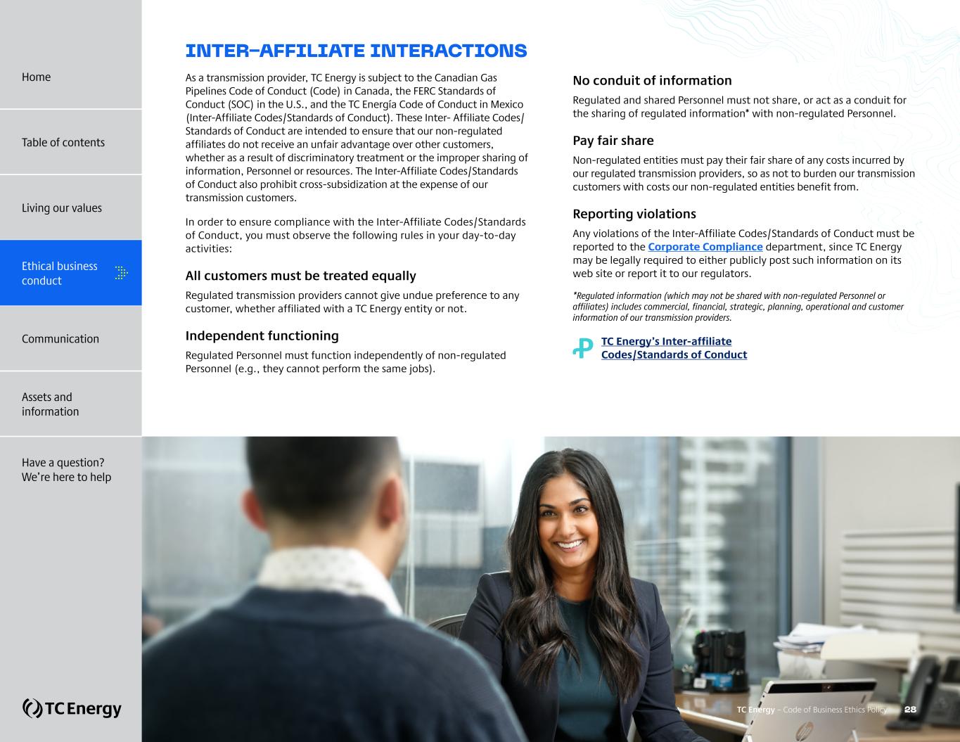 INTER-AFFILIATE INTERACTIONS As a transmission provider, TC Energy is subject to the Canadian Gas Pipelines Code of Conduct (Code) in Canada, the FERC Standards of Conduct (SOC) in the U.S., and the TC Energía Code of Conduct in Mexico (Inter-Affiliate Codes/Standards of Conduct). These Inter- Affiliate Codes/ Standards of Conduct are intended to ensure that our non-regulated affiliates do not receive an unfair advantage over other customers, whether as a result of discriminatory treatment or the improper sharing of information, Personnel or resources. The Inter-Affiliate Codes/Standards of Conduct also prohibit cross-subsidization at the expense of our transmission customers. In order to ensure compliance with the Inter-Affiliate Codes/Standards of Conduct, you must observe the following rules in your day-to-day activities: All customers must be treated equally Regulated transmission providers cannot give undue preference to any customer, whether affiliated with a TC Energy entity or not. Independent functioning Regulated Personnel must function independently of non-regulated Personnel (e.g., they cannot perform the same jobs). No conduit of information Regulated and shared Personnel must not share, or act as a conduit for the sharing of regulated information* with non-regulated Personnel. Pay fair share Non-regulated entities must pay their fair share of any costs incurred by our regulated transmission providers, so as not to burden our transmission customers with costs our non-regulated entities benefit from. Reporting violations Any violations of the Inter-Affiliate Codes/Standards of Conduct must be reported to the Corporate Compliance department, since TC Energy may be legally required to either publicly post such information on its web site or report it to our regulators. *Regulated information (which may not be shared with non-regulated Personnel or affiliates) includes commercial, financial, strategic, planning, operational and customer information of our transmission providers. Ꝓ TC Energy’s Inter-affiliate Codes/Standards of Conduct TC Energy – Code of Business Ethics Policy 28 Home Table of contents Living our values Ethical business conduct Communication Assets and information Have a question? We’re here to help