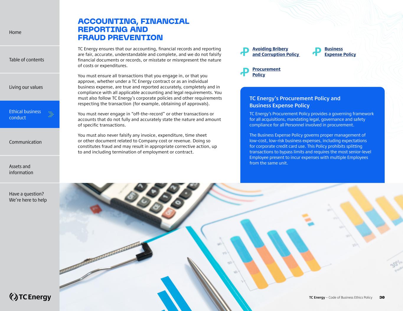 ACCOUNTING, FINANCIAL REPORTING AND FRAUD PREVENTION TC Energy ensures that our accounting, financial records and reporting are fair, accurate, understandable and complete, and we do not falsify financial documents or records, or misstate or misrepresent the nature of costs or expenditures. You must ensure all transactions that you engage in, or that you approve, whether under a TC Energy contract or as an individual business expense, are true and reported accurately, completely and in compliance with all applicable accounting and legal requirements. You must also follow TC Energy’s corporate policies and other requirements respecting the transaction (for example, obtaining of approvals). You must never engage in “off-the-record” or other transactions or accounts that do not fully and accurately state the nature and amount of specific transactions. You must also never falsify any invoice, expenditure, time sheet or other document related to Company cost or revenue. Doing so constitutes fraud and may result in appropriate corrective action, up to and including termination of employment or contract. Ꝓ Avoiding Bribery and Corruption Policy Ꝓ Procurement Policy Ꝓ Business Expense Policy TC Energy’s Procurement Policy and Business Expense Policy TC Energy’s Procurement Policy provides a governing framework for all acquisitions, mandating legal, governance and safety compliance for all Personnel involved in procurement. The Business Expense Policy governs proper management of low-cost, low-risk business expenses, including expectations for corporate credit card use. This Policy prohibits splitting transactions to bypass limits and requires the most senior-level Employee present to incur expenses with multiple Employees from the same unit. Home Table of contents Living our values Ethical business conduct Communication Assets and information Have a question? We’re here to help TC Energy – Code of Business Ethics Policy 30