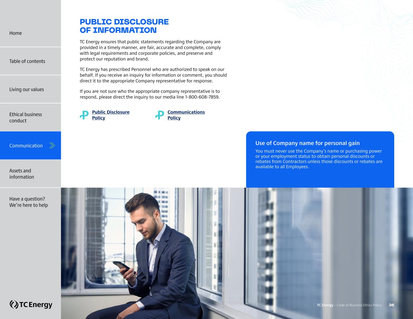 PUBLIC DISCLOSURE OF INFORMATION TC Energy ensures that public statements regarding the Company are provided in a timely manner, are fair, accurate and complete, comply with legal requirements and corporate policies, and preserve and protect our reputation and brand. TC Energy has prescribed Personnel who are authorized to speak on our behalf. If you receive an inquiry for information or comment, you should direct it to the appropriate Company representative for response. If you are not sure who the appropriate company representative is to respond, please direct the inquiry to our media line 1-800-608-7859. Ꝓ Public Disclosure Policy Ꝓ Communications Policy Use of Company name for personal gain You must never use the Company’s name or purchasing power or your employment status to obtain personal discounts or rebates from Contractors unless those discounts or rebates are available to all Employees. TC Energy – Code of Business Ethics Policy 36 Home Table of contents Living our values Ethical business conduct Communication Assets and information Have a question? We’re here to help