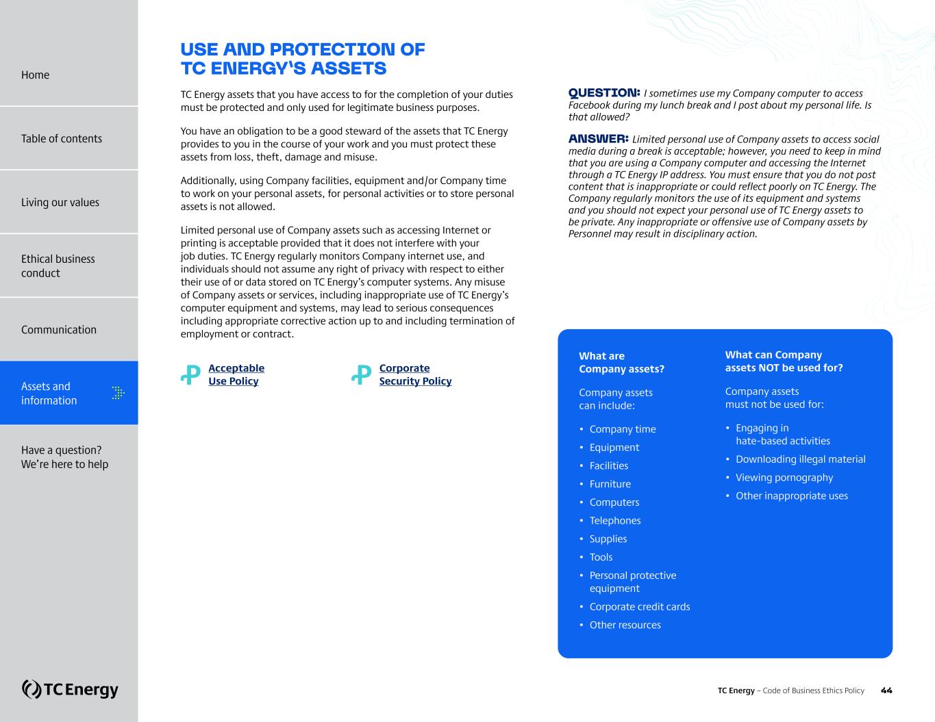 ASSETS AND INFORMATION + Protecting confidential information + Protecting personal information + Managing and maintaining the security of information + Protecting and respecting intellectual property rights + Use and protection of TC Energy assets TC Energy – Code of Business Ethics Policy 39 Home Table of contents Living our values Ethical business conduct Communication Have a question? We’re here to help Assets and information
