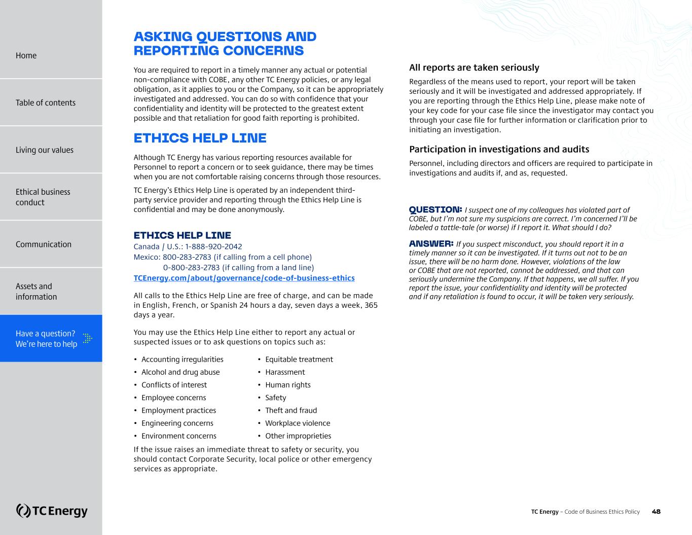 HAVE A QUESTION? WE’RE HERE TO HELP + Your responsibility and non-retaliation + Asking questions and reporting concerns TC Energy – Code of Business Ethics Policy 46 Home Table of contents Living our values Ethical business conduct Communication Assets and information Have a question? We’re here to help