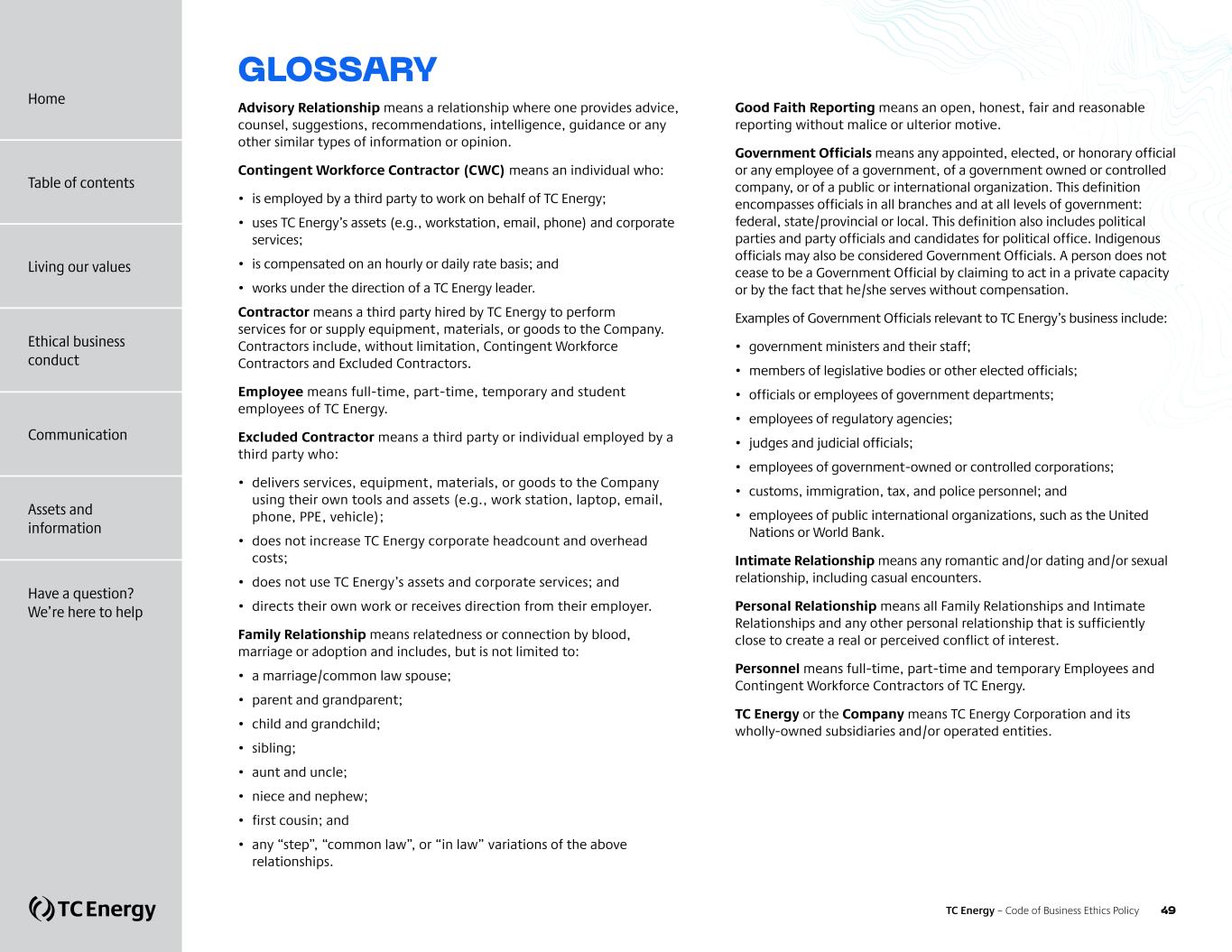 GLOSSARY Advisory Relationship means a relationship where one provides advice, counsel, suggestions, recommendations, intelligence, guidance or any other similar types of information or opinion. Contingent Workforce Contractor (CWC) means an individual who: • is employed by a third party to work on behalf of TC Energy; • uses TC Energy’s assets (e.g., workstation, email, phone) and corporate services; • is compensated on an hourly or daily rate basis; and • works under the direction of a TC Energy leader. Contractor means a third party hired by TC Energy to perform services for or supply equipment, materials, or goods to the Company. Contractors include, without limitation, Contingent Workforce Contractors and Excluded Contractors. Employee means full-time, part-time, temporary and student employees of TC Energy. Excluded Contractor means a third party or individual employed by a third party who: • delivers services, equipment, materials, or goods to the Company using their own tools and assets (e.g., work station, laptop, email, phone, PPE, vehicle); • does not increase TC Energy corporate headcount and overhead costs; • does not use TC Energy’s assets and corporate services; and • directs their own work or receives direction from their employer. Family Relationship means relatedness or connection by blood, marriage or adoption and includes, but is not limited to: • a marriage/common law spouse; • parent and grandparent; • child and grandchild; • sibling; • aunt and uncle; • niece and nephew; • first cousin; and • any “step”, “common law”, or “in law” variations of the above relationships. Good Faith Reporting means an open, honest, fair and reasonable reporting without malice or ulterior motive. Government Officials means any appointed, elected, or honorary official or any employee of a government, of a government owned or controlled company, or of a public or international organization. This definition encompasses officials in all branches and at all levels of government: federal, state/provincial or local. This definition also includes political parties and party officials and candidates for political office. Indigenous officials may also be considered Government Officials. A person does not cease to be a Government Official by claiming to act in a private capacity or by the fact that he/she serves without compensation. Examples of Government Officials relevant to TC Energy’s business include: • government ministers and their staff; • members of legislative bodies or other elected officials; • officials or employees of government departments; • employees of regulatory agencies; • judges and judicial officials; • employees of government-owned or controlled corporations; • customs, immigration, tax, and police personnel; and • employees of public international organizations, such as the United Nations or World Bank. Intimate Relationship means any romantic and/or dating and/or sexual relationship, including casual encounters. Personal Relationship means all Family Relationships and Intimate Relationships and any other personal relationship that is sufficiently close to create a real or perceived conflict of interest. Personnel means full-time, part-time and temporary Employees and Contingent Workforce Contractors of TC Energy. TC Energy or the Company means TC Energy Corporation and its wholly-owned subsidiaries and/or operated entities. TC Energy – Code of Business Ethics Policy 49 Home Living our values Ethical business conduct Communication Assets and information Have a question? We’re here to help Table of contents