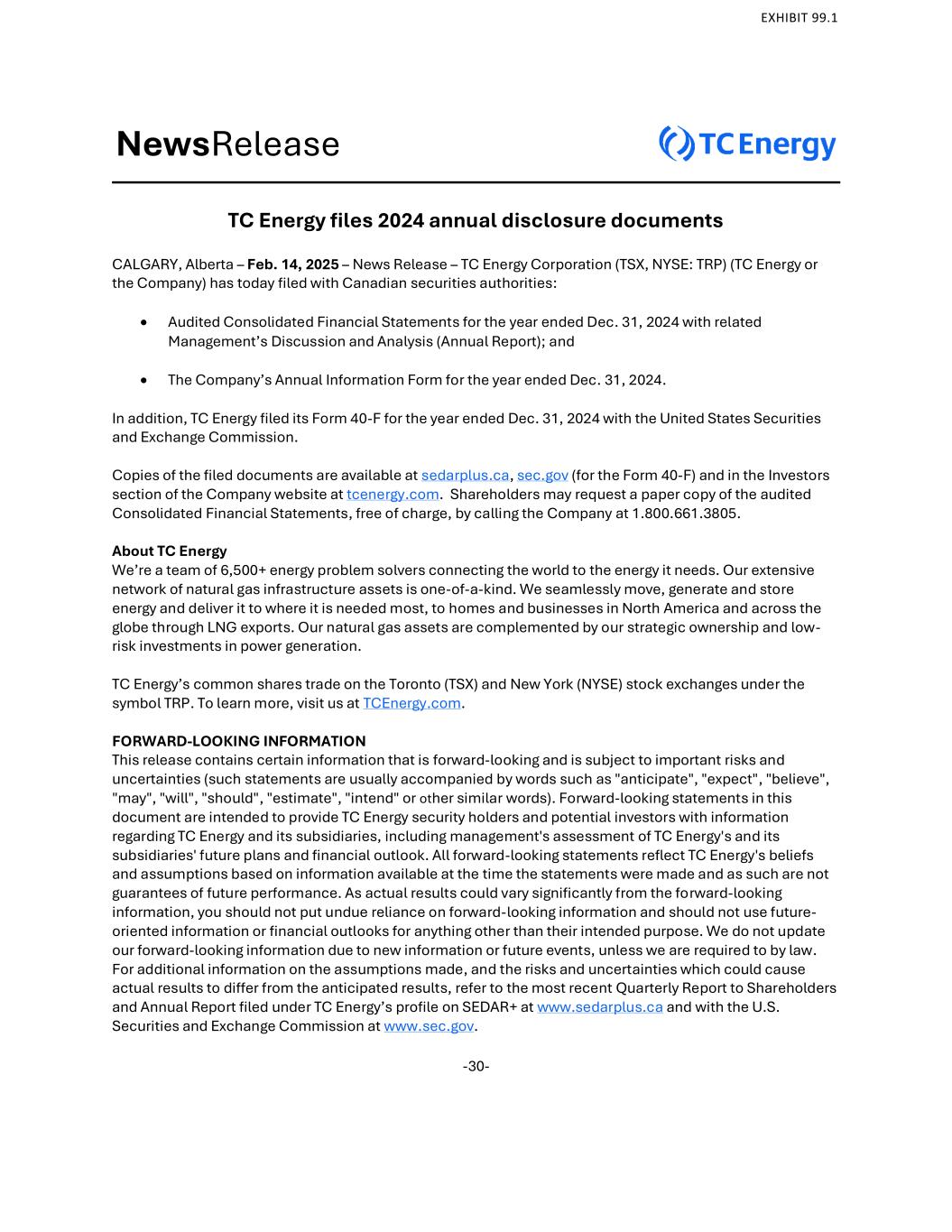 NewsRelease TC Energy files 2024 annual disclosure documents CALGARY, Alberta – Feb. 14, 2025 – News Release – TC Energy Corporation (TSX, NYSE: TRP) (TC Energy or the Company) has today filed with Canadian securities authorities: • Audited Consolidated Financial Statements for the year ended Dec. 31, 2024 with related Management’s Discussion and Analysis (Annual Report); and • The Company’s Annual Information Form for the year ended Dec. 31, 2024. In addition, TC Energy filed its Form 40-F for the year ended Dec. 31, 2024 with the United States Securities and Exchange Commission. Copies of the filed documents are available at sedarplus.ca, sec.gov (for the Form 40-F) and in the Investors section of the Company website at tcenergy.com. Shareholders may request a paper copy of the audited Consolidated Financial Statements, free of charge, by calling the Company at 1.800.661.3805. About TC Energy We’re a team of 6,500+ energy problem solvers connecting the world to the energy it needs. Our extensive network of natural gas infrastructure assets is one-of-a-kind. We seamlessly move, generate and store energy and deliver it to where it is needed most, to homes and businesses in North America and across the globe through LNG exports. Our natural gas assets are complemented by our strategic ownership and low- risk investments in power generation. TC Energy’s common shares trade on the Toronto (TSX) and New York (NYSE) stock exchanges under the symbol TRP. To learn more, visit us at TCEnergy.com. FORWARD-LOOKING INFORMATION This release contains certain information that is forward-looking and is subject to important risks and uncertainties (such statements are usually accompanied by words such as "anticipate", "expect", "believe", "may", "will", "should", "estimate", "intend" or other similar words). Forward-looking statements in this document are intended to provide TC Energy security holders and potential investors with information regarding TC Energy and its subsidiaries, including management's assessment of TC Energy's and its subsidiaries' future plans and financial outlook. All forward-looking statements reflect TC Energy's beliefs and assumptions based on information available at the time the statements were made and as such are not guarantees of future performance. As actual results could vary significantly from the forward-looking information, you should not put undue reliance on forward-looking information and should not use future- oriented information or financial outlooks for anything other than their intended purpose. We do not update our forward-looking information due to new information or future events, unless we are required to by law. For additional information on the assumptions made, and the risks and uncertainties which could cause actual results to differ from the anticipated results, refer to the most recent Quarterly Report to Shareholders and Annual Report filed under TC Energy’s profile on SEDAR+ at www.sedarplus.ca and with the U.S. Securities and Exchange Commission at www.sec.gov. -30- EXHIBIT 99.1
