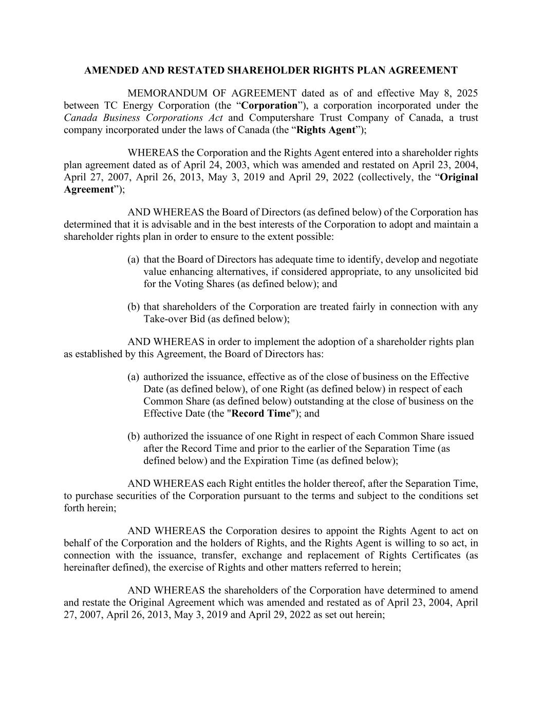 AMENDED AND RESTATED SHAREHOLDER RIGHTS PLAN AGREEMENT MEMORANDUM OF AGREEMENT dated as of and effective May 8, 2025 between TC Energy Corporation (the “Corporation”), a corporation incorporated under the Canada Business Corporations Act and Computershare Trust Company of Canada, a trust company incorporated under the laws of Canada (the “Rights Agent”); WHEREAS the Corporation and the Rights Agent entered into a shareholder rights plan agreement dated as of April 24, 2003, which was amended and restated on April 23, 2004, April 27, 2007, April 26, 2013, May 3, 2019 and April 29, 2022 (collectively, the “Original Agreement”); AND WHEREAS the Board of Directors (as defined below) of the Corporation has determined that it is advisable and in the best interests of the Corporation to adopt and maintain a shareholder rights plan in order to ensure to the extent possible: (a) that the Board of Directors has adequate time to identify, develop and negotiate value enhancing alternatives, if considered appropriate, to any unsolicited bid for the Voting Shares (as defined below); and (b) that shareholders of the Corporation are treated fairly in connection with any Take-over Bid (as defined below); AND WHEREAS in order to implement the adoption of a shareholder rights plan as established by this Agreement, the Board of Directors has: (a) authorized the issuance, effective as of the close of business on the Effective Date (as defined below), of one Right (as defined below) in respect of each Common Share (as defined below) outstanding at the close of business on the Effective Date (the "Record Time"); and (b) authorized the issuance of one Right in respect of each Common Share issued after the Record Time and prior to the earlier of the Separation Time (as defined below) and the Expiration Time (as defined below); AND WHEREAS each Right entitles the holder thereof, after the Separation Time, to purchase securities of the Corporation pursuant to the terms and subject to the conditions set forth herein; AND WHEREAS the Corporation desires to appoint the Rights Agent to act on behalf of the Corporation and the holders of Rights, and the Rights Agent is willing to so act, in connection with the issuance, transfer, exchange and replacement of Rights Certificates (as hereinafter defined), the exercise of Rights and other matters referred to herein; AND WHEREAS the shareholders of the Corporation have determined to amend and restate the Original Agreement which was amended and restated as of April 23, 2004, April 27, 2007, April 26, 2013, May 3, 2019 and April 29, 2022 as set out herein;