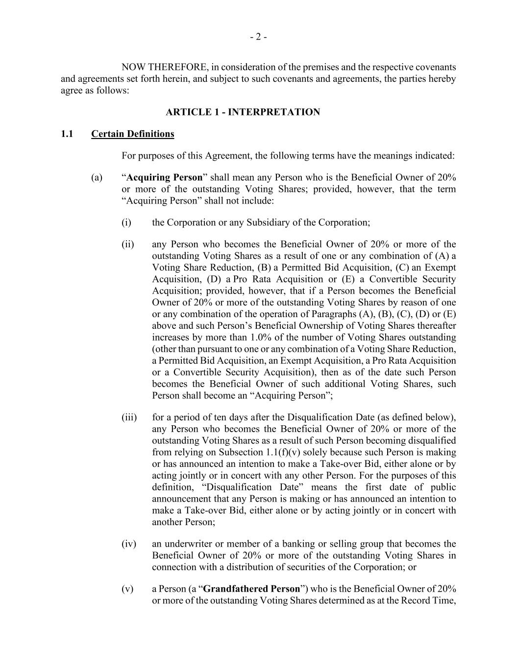 - 2 - NOW THEREFORE, in consideration of the premises and the respective covenants and agreements set forth herein, and subject to such covenants and agreements, the parties hereby agree as follows: ARTICLE 1 - INTERPRETATION 1.1 Certain Definitions For purposes of this Agreement, the following terms have the meanings indicated: (a) “Acquiring Person” shall mean any Person who is the Beneficial Owner of 20% or more of the outstanding Voting Shares; provided, however, that the term “Acquiring Person” shall not include: (i) the Corporation or any Subsidiary of the Corporation; (ii) any Person who becomes the Beneficial Owner of 20% or more of the outstanding Voting Shares as a result of one or any combination of (A) a Voting Share Reduction, (B) a Permitted Bid Acquisition, (C) an Exempt Acquisition, (D) a Pro Rata Acquisition or (E) a Convertible Security Acquisition; provided, however, that if a Person becomes the Beneficial Owner of 20% or more of the outstanding Voting Shares by reason of one or any combination of the operation of Paragraphs (A), (B), (C), (D) or (E) above and such Person’s Beneficial Ownership of Voting Shares thereafter increases by more than 1.0% of the number of Voting Shares outstanding (other than pursuant to one or any combination of a Voting Share Reduction, a Permitted Bid Acquisition, an Exempt Acquisition, a Pro Rata Acquisition or a Convertible Security Acquisition), then as of the date such Person becomes the Beneficial Owner of such additional Voting Shares, such Person shall become an “Acquiring Person”; (iii) for a period of ten days after the Disqualification Date (as defined below), any Person who becomes the Beneficial Owner of 20% or more of the outstanding Voting Shares as a result of such Person becoming disqualified from relying on Subsection 1.1(f)(v) solely because such Person is making or has announced an intention to make a Take-over Bid, either alone or by acting jointly or in concert with any other Person. For the purposes of this definition, “Disqualification Date” means the first date of public announcement that any Person is making or has announced an intention to make a Take-over Bid, either alone or by acting jointly or in concert with another Person; (iv) an underwriter or member of a banking or selling group that becomes the Beneficial Owner of 20% or more of the outstanding Voting Shares in connection with a distribution of securities of the Corporation; or (v) a Person (a “Grandfathered Person”) who is the Beneficial Owner of 20% or more of the outstanding Voting Shares determined as at the Record Time,