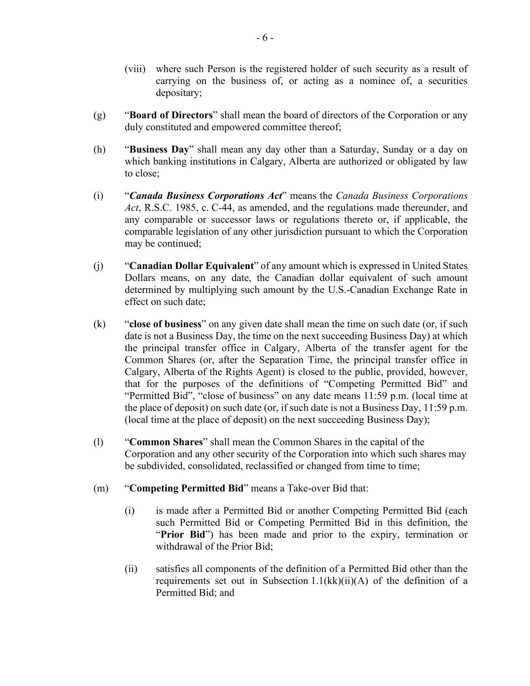 - 6 - (viii) where such Person is the registered holder of such security as a result of carrying on the business of, or acting as a nominee of, a securities depositary; (g) “Board of Directors” shall mean the board of directors of the Corporation or any duly constituted and empowered committee thereof; (h) “Business Day” shall mean any day other than a Saturday, Sunday or a day on which banking institutions in Calgary, Alberta are authorized or obligated by law to close; (i) “Canada Business Corporations Act” means the Canada Business Corporations Act, R.S.C. 1985, c. C-44, as amended, and the regulations made thereunder, and any comparable or successor laws or regulations thereto or, if applicable, the comparable legislation of any other jurisdiction pursuant to which the Corporation may be continued; (j) “Canadian Dollar Equivalent” of any amount which is expressed in United States Dollars means, on any date, the Canadian dollar equivalent of such amount determined by multiplying such amount by the U.S.-Canadian Exchange Rate in effect on such date; (k) “close of business” on any given date shall mean the time on such date (or, if such date is not a Business Day, the time on the next succeeding Business Day) at which the principal transfer office in Calgary, Alberta of the transfer agent for the Common Shares (or, after the Separation Time, the principal transfer office in Calgary, Alberta of the Rights Agent) is closed to the public, provided, however, that for the purposes of the definitions of “Competing Permitted Bid” and “Permitted Bid”, “close of business” on any date means 11:59 p.m. (local time at the place of deposit) on such date (or, if such date is not a Business Day, 11:59 p.m. (local time at the place of deposit) on the next succeeding Business Day); (l) “Common Shares” shall mean the Common Shares in the capital of the Corporation and any other security of the Corporation into which such shares may be subdivided, consolidated, reclassified or changed from time to time; (m) “Competing Permitted Bid” means a Take-over Bid that: (i) is made after a Permitted Bid or another Competing Permitted Bid (each such Permitted Bid or Competing Permitted Bid in this definition, the “Prior Bid”) has been made and prior to the expiry, termination or withdrawal of the Prior Bid; (ii) satisfies all components of the definition of a Permitted Bid other than the requirements set out in Subsection 1.1(kk)(ii)(A) of the definition of a Permitted Bid; and