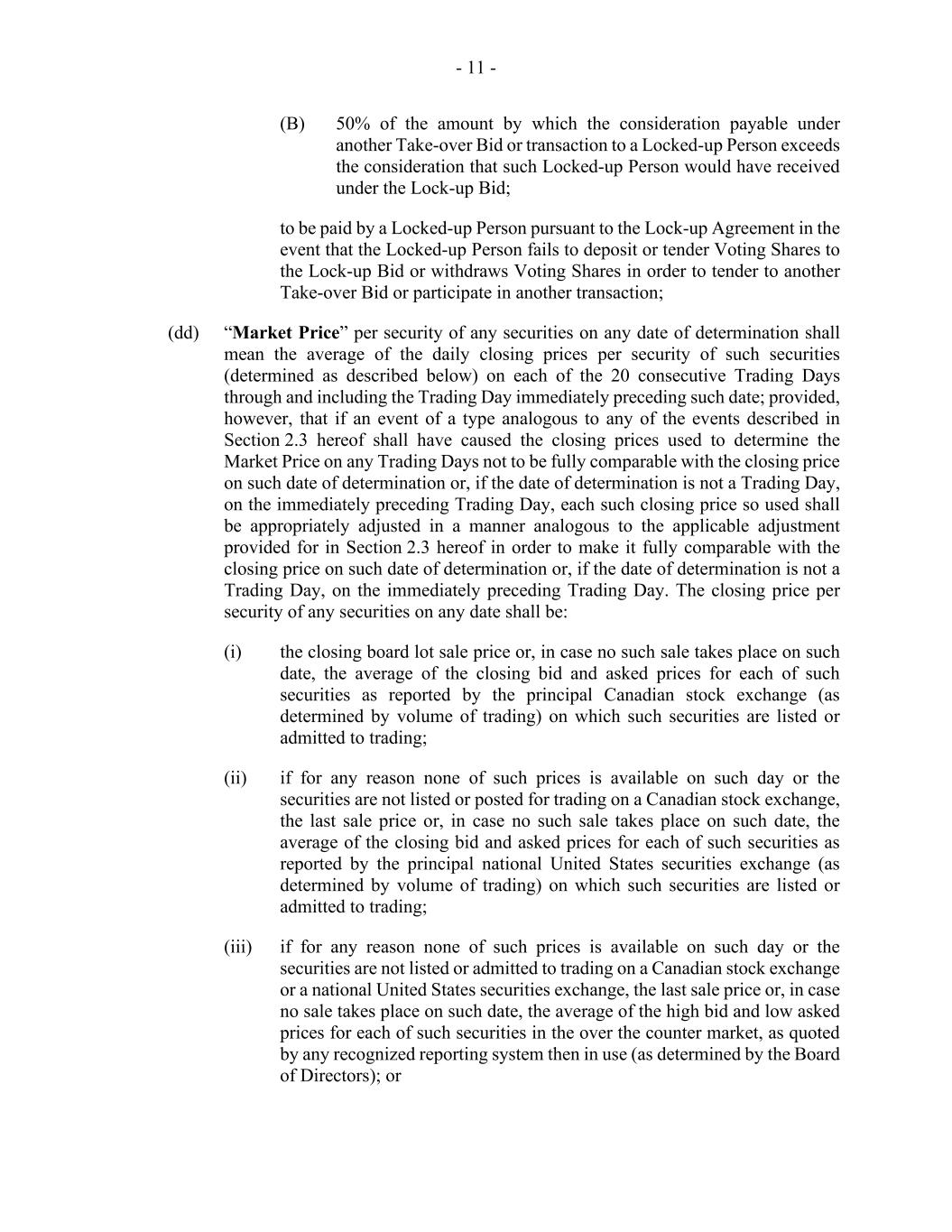 - 11 - (B) 50% of the amount by which the consideration payable under another Take-over Bid or transaction to a Locked-up Person exceeds the consideration that such Locked-up Person would have received under the Lock-up Bid; to be paid by a Locked-up Person pursuant to the Lock-up Agreement in the event that the Locked-up Person fails to deposit or tender Voting Shares to the Lock-up Bid or withdraws Voting Shares in order to tender to another Take-over Bid or participate in another transaction; (dd) “Market Price” per security of any securities on any date of determination shall mean the average of the daily closing prices per security of such securities (determined as described below) on each of the 20 consecutive Trading Days through and including the Trading Day immediately preceding such date; provided, however, that if an event of a type analogous to any of the events described in Section 2.3 hereof shall have caused the closing prices used to determine the Market Price on any Trading Days not to be fully comparable with the closing price on such date of determination or, if the date of determination is not a Trading Day, on the immediately preceding Trading Day, each such closing price so used shall be appropriately adjusted in a manner analogous to the applicable adjustment provided for in Section 2.3 hereof in order to make it fully comparable with the closing price on such date of determination or, if the date of determination is not a Trading Day, on the immediately preceding Trading Day. The closing price per security of any securities on any date shall be: (i) the closing board lot sale price or, in case no such sale takes place on such date, the average of the closing bid and asked prices for each of such securities as reported by the principal Canadian stock exchange (as determined by volume of trading) on which such securities are listed or admitted to trading; (ii) if for any reason none of such prices is available on such day or the securities are not listed or posted for trading on a Canadian stock exchange, the last sale price or, in case no such sale takes place on such date, the average of the closing bid and asked prices for each of such securities as reported by the principal national United States securities exchange (as determined by volume of trading) on which such securities are listed or admitted to trading; (iii) if for any reason none of such prices is available on such day or the securities are not listed or admitted to trading on a Canadian stock exchange or a national United States securities exchange, the last sale price or, in case no sale takes place on such date, the average of the high bid and low asked prices for each of such securities in the over the counter market, as quoted by any recognized reporting system then in use (as determined by the Board of Directors); or