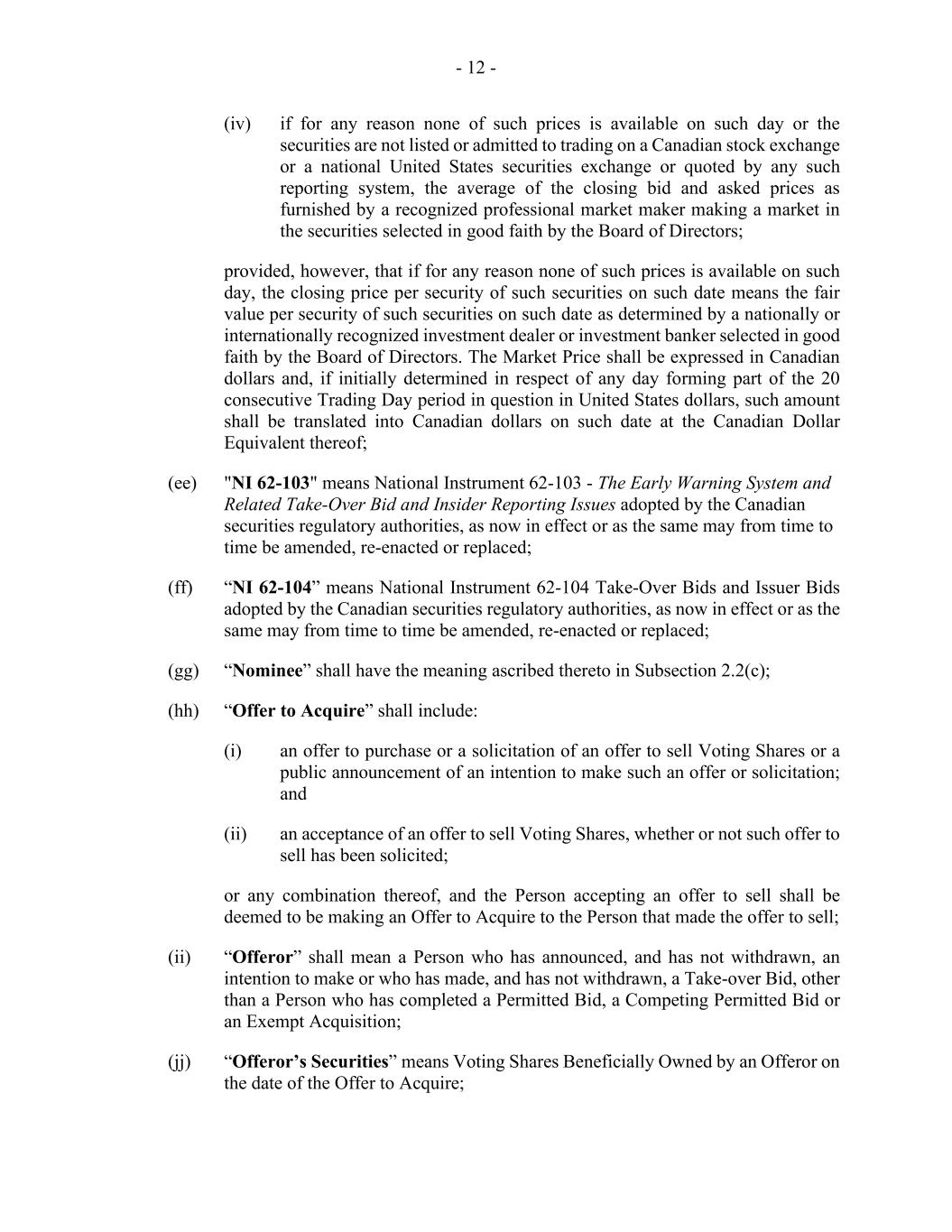 - 12 - (iv) if for any reason none of such prices is available on such day or the securities are not listed or admitted to trading on a Canadian stock exchange or a national United States securities exchange or quoted by any such reporting system, the average of the closing bid and asked prices as furnished by a recognized professional market maker making a market in the securities selected in good faith by the Board of Directors; provided, however, that if for any reason none of such prices is available on such day, the closing price per security of such securities on such date means the fair value per security of such securities on such date as determined by a nationally or internationally recognized investment dealer or investment banker selected in good faith by the Board of Directors. The Market Price shall be expressed in Canadian dollars and, if initially determined in respect of any day forming part of the 20 consecutive Trading Day period in question in United States dollars, such amount shall be translated into Canadian dollars on such date at the Canadian Dollar Equivalent thereof; (ee) "NI 62-103" means National Instrument 62-103 - The Early Warning System and Related Take-Over Bid and Insider Reporting Issues adopted by the Canadian securities regulatory authorities, as now in effect or as the same may from time to time be amended, re-enacted or replaced; (ff) “NI 62-104” means National Instrument 62-104 Take-Over Bids and Issuer Bids adopted by the Canadian securities regulatory authorities, as now in effect or as the same may from time to time be amended, re-enacted or replaced; (gg) “Nominee” shall have the meaning ascribed thereto in Subsection 2.2(c); (hh) “Offer to Acquire” shall include: (i) an offer to purchase or a solicitation of an offer to sell Voting Shares or a public announcement of an intention to make such an offer or solicitation; and (ii) an acceptance of an offer to sell Voting Shares, whether or not such offer to sell has been solicited; or any combination thereof, and the Person accepting an offer to sell shall be deemed to be making an Offer to Acquire to the Person that made the offer to sell; (ii) “Offeror” shall mean a Person who has announced, and has not withdrawn, an intention to make or who has made, and has not withdrawn, a Take-over Bid, other than a Person who has completed a Permitted Bid, a Competing Permitted Bid or an Exempt Acquisition; (jj) “Offeror’s Securities” means Voting Shares Beneficially Owned by an Offeror on the date of the Offer to Acquire;