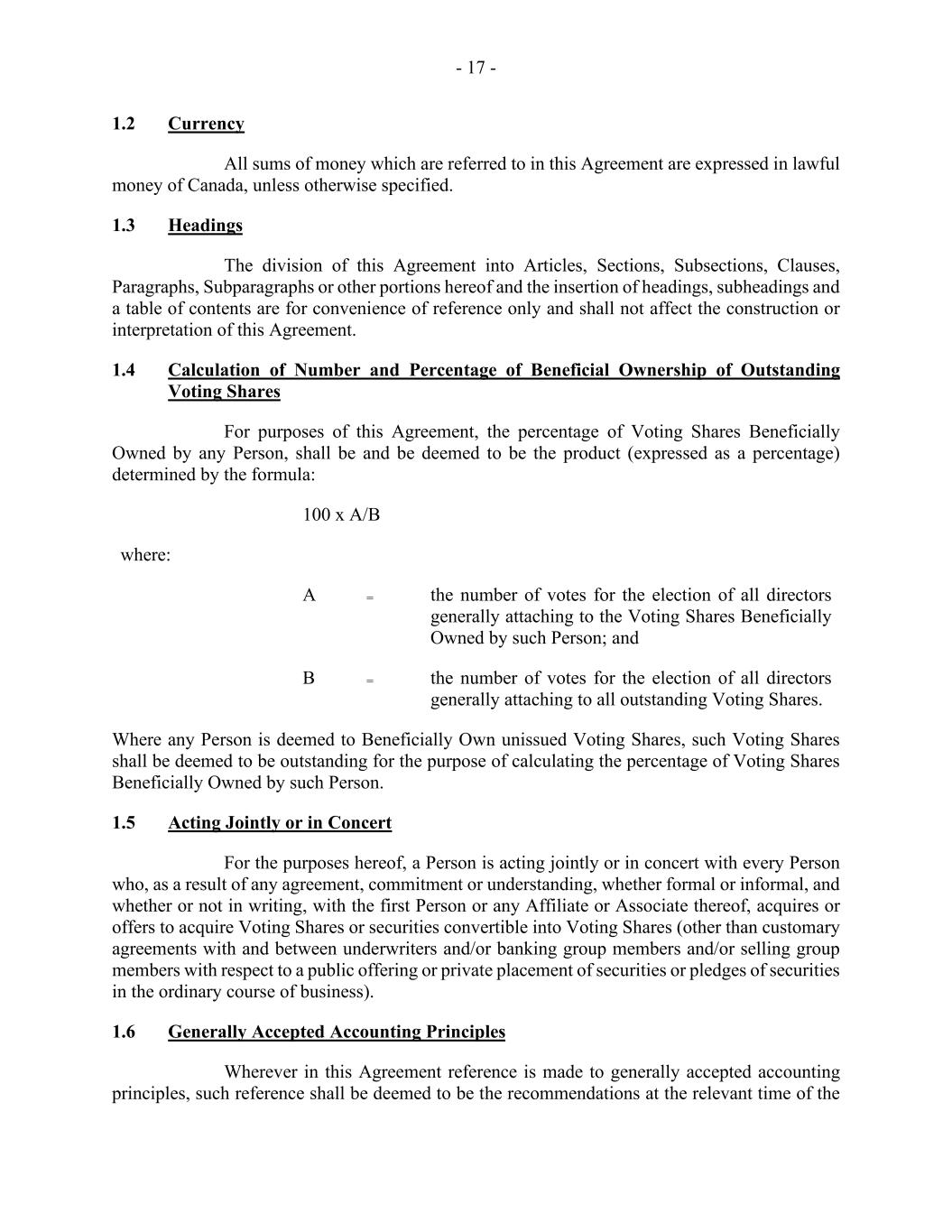 - 17 - 1.2 Currency All sums of money which are referred to in this Agreement are expressed in lawful money of Canada, unless otherwise specified. 1.3 Headings The division of this Agreement into Articles, Sections, Subsections, Clauses, Paragraphs, Subparagraphs or other portions hereof and the insertion of headings, subheadings and a table of contents are for convenience of reference only and shall not affect the construction or interpretation of this Agreement. 1.4 Calculation of Number and Percentage of Beneficial Ownership of Outstanding Voting Shares For purposes of this Agreement, the percentage of Voting Shares Beneficially Owned by any Person, shall be and be deemed to be the product (expressed as a percentage) determined by the formula: 100 x A/B where: A = the number of votes for the election of all directors generally attaching to the Voting Shares Beneficially Owned by such Person; and B = the number of votes for the election of all directors generally attaching to all outstanding Voting Shares. Where any Person is deemed to Beneficially Own unissued Voting Shares, such Voting Shares shall be deemed to be outstanding for the purpose of calculating the percentage of Voting Shares Beneficially Owned by such Person. 1.5 Acting Jointly or in Concert For the purposes hereof, a Person is acting jointly or in concert with every Person who, as a result of any agreement, commitment or understanding, whether formal or informal, and whether or not in writing, with the first Person or any Affiliate or Associate thereof, acquires or offers to acquire Voting Shares or securities convertible into Voting Shares (other than customary agreements with and between underwriters and/or banking group members and/or selling group members with respect to a public offering or private placement of securities or pledges of securities in the ordinary course of business). 1.6 Generally Accepted Accounting Principles Wherever in this Agreement reference is made to generally accepted accounting principles, such reference shall be deemed to be the recommendations at the relevant time of the