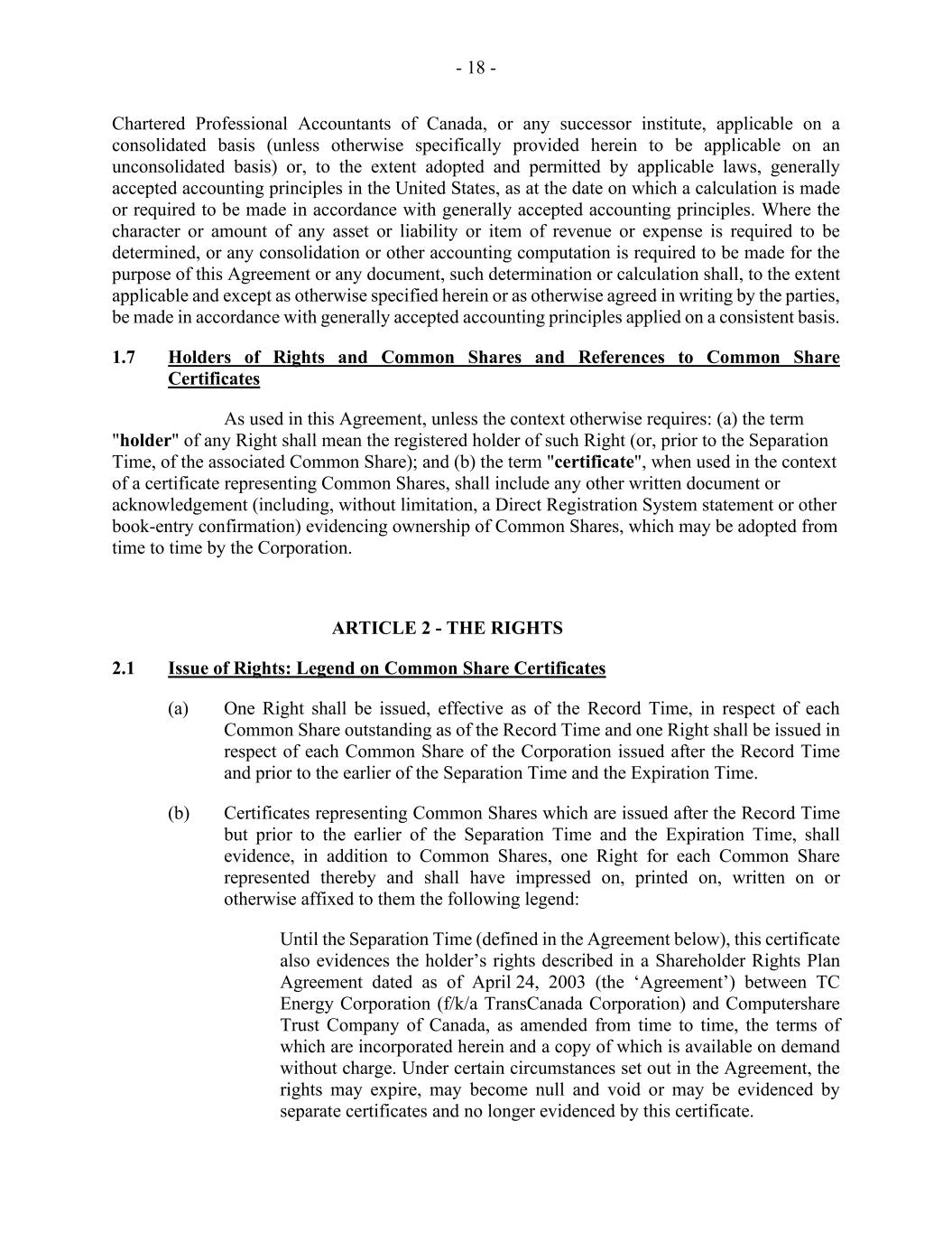 - 18 - Chartered Professional Accountants of Canada, or any successor institute, applicable on a consolidated basis (unless otherwise specifically provided herein to be applicable on an unconsolidated basis) or, to the extent adopted and permitted by applicable laws, generally accepted accounting principles in the United States, as at the date on which a calculation is made or required to be made in accordance with generally accepted accounting principles. Where the character or amount of any asset or liability or item of revenue or expense is required to be determined, or any consolidation or other accounting computation is required to be made for the purpose of this Agreement or any document, such determination or calculation shall, to the extent applicable and except as otherwise specified herein or as otherwise agreed in writing by the parties, be made in accordance with generally accepted accounting principles applied on a consistent basis. 1.7 Holders of Rights and Common Shares and References to Common Share Certificates As used in this Agreement, unless the context otherwise requires: (a) the term "holder" of any Right shall mean the registered holder of such Right (or, prior to the Separation Time, of the associated Common Share); and (b) the term "certificate", when used in the context of a certificate representing Common Shares, shall include any other written document or acknowledgement (including, without limitation, a Direct Registration System statement or other book-entry confirmation) evidencing ownership of Common Shares, which may be adopted from time to time by the Corporation. ARTICLE 2 - THE RIGHTS 2.1 Issue of Rights: Legend on Common Share Certificates (a) One Right shall be issued, effective as of the Record Time, in respect of each Common Share outstanding as of the Record Time and one Right shall be issued in respect of each Common Share of the Corporation issued after the Record Time and prior to the earlier of the Separation Time and the Expiration Time. (b) Certificates representing Common Shares which are issued after the Record Time but prior to the earlier of the Separation Time and the Expiration Time, shall evidence, in addition to Common Shares, one Right for each Common Share represented thereby and shall have impressed on, printed on, written on or otherwise affixed to them the following legend: Until the Separation Time (defined in the Agreement below), this certificate also evidences the holder’s rights described in a Shareholder Rights Plan Agreement dated as of April 24, 2003 (the ‘Agreement’) between TC Energy Corporation (f/k/a TransCanada Corporation) and Computershare Trust Company of Canada, as amended from time to time, the terms of which are incorporated herein and a copy of which is available on demand without charge. Under certain circumstances set out in the Agreement, the rights may expire, may become null and void or may be evidenced by separate certificates and no longer evidenced by this certificate.