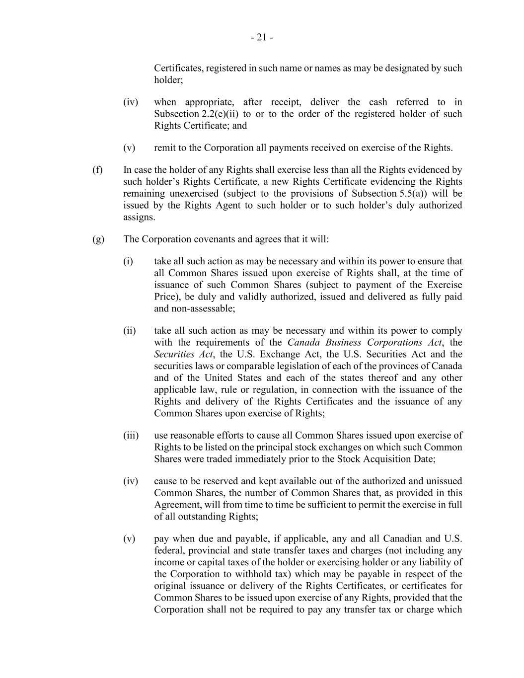 - 21 - Certificates, registered in such name or names as may be designated by such holder; (iv) when appropriate, after receipt, deliver the cash referred to in Subsection 2.2(e)(ii) to or to the order of the registered holder of such Rights Certificate; and (v) remit to the Corporation all payments received on exercise of the Rights. (f) In case the holder of any Rights shall exercise less than all the Rights evidenced by such holder’s Rights Certificate, a new Rights Certificate evidencing the Rights remaining unexercised (subject to the provisions of Subsection 5.5(a)) will be issued by the Rights Agent to such holder or to such holder’s duly authorized assigns. (g) The Corporation covenants and agrees that it will: (i) take all such action as may be necessary and within its power to ensure that all Common Shares issued upon exercise of Rights shall, at the time of issuance of such Common Shares (subject to payment of the Exercise Price), be duly and validly authorized, issued and delivered as fully paid and non-assessable; (ii) take all such action as may be necessary and within its power to comply with the requirements of the Canada Business Corporations Act, the Securities Act, the U.S. Exchange Act, the U.S. Securities Act and the securities laws or comparable legislation of each of the provinces of Canada and of the United States and each of the states thereof and any other applicable law, rule or regulation, in connection with the issuance of the Rights and delivery of the Rights Certificates and the issuance of any Common Shares upon exercise of Rights; (iii) use reasonable efforts to cause all Common Shares issued upon exercise of Rights to be listed on the principal stock exchanges on which such Common Shares were traded immediately prior to the Stock Acquisition Date; (iv) cause to be reserved and kept available out of the authorized and unissued Common Shares, the number of Common Shares that, as provided in this Agreement, will from time to time be sufficient to permit the exercise in full of all outstanding Rights; (v) pay when due and payable, if applicable, any and all Canadian and U.S. federal, provincial and state transfer taxes and charges (not including any income or capital taxes of the holder or exercising holder or any liability of the Corporation to withhold tax) which may be payable in respect of the original issuance or delivery of the Rights Certificates, or certificates for Common Shares to be issued upon exercise of any Rights, provided that the Corporation shall not be required to pay any transfer tax or charge which
