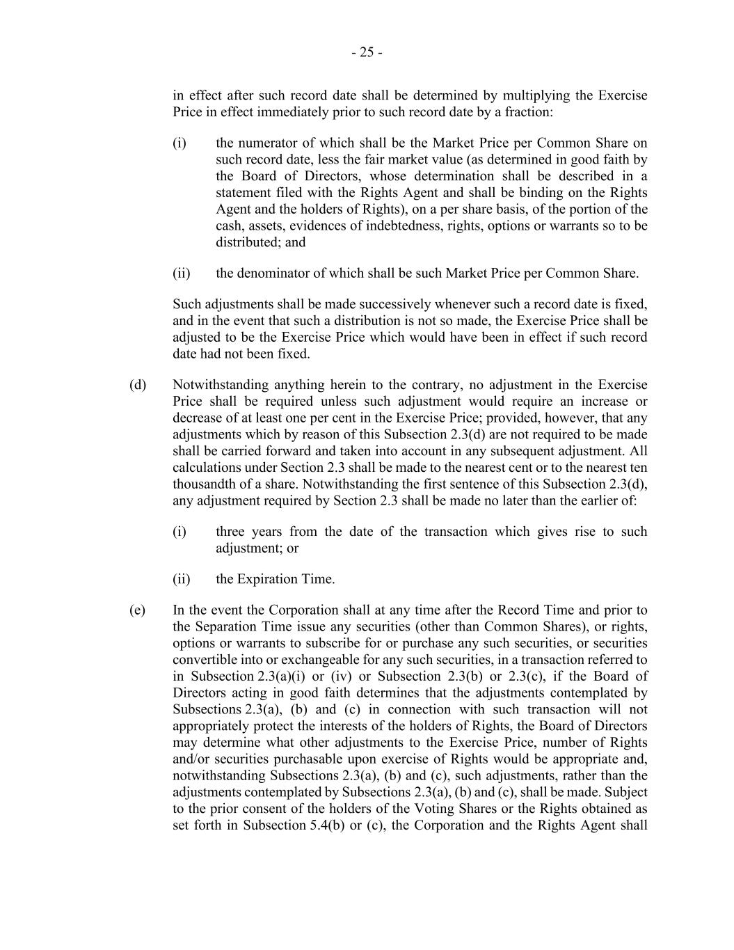 - 25 - in effect after such record date shall be determined by multiplying the Exercise Price in effect immediately prior to such record date by a fraction: (i) the numerator of which shall be the Market Price per Common Share on such record date, less the fair market value (as determined in good faith by the Board of Directors, whose determination shall be described in a statement filed with the Rights Agent and shall be binding on the Rights Agent and the holders of Rights), on a per share basis, of the portion of the cash, assets, evidences of indebtedness, rights, options or warrants so to be distributed; and (ii) the denominator of which shall be such Market Price per Common Share. Such adjustments shall be made successively whenever such a record date is fixed, and in the event that such a distribution is not so made, the Exercise Price shall be adjusted to be the Exercise Price which would have been in effect if such record date had not been fixed. (d) Notwithstanding anything herein to the contrary, no adjustment in the Exercise Price shall be required unless such adjustment would require an increase or decrease of at least one per cent in the Exercise Price; provided, however, that any adjustments which by reason of this Subsection 2.3(d) are not required to be made shall be carried forward and taken into account in any subsequent adjustment. All calculations under Section 2.3 shall be made to the nearest cent or to the nearest ten thousandth of a share. Notwithstanding the first sentence of this Subsection 2.3(d), any adjustment required by Section 2.3 shall be made no later than the earlier of: (i) three years from the date of the transaction which gives rise to such adjustment; or (ii) the Expiration Time. (e) In the event the Corporation shall at any time after the Record Time and prior to the Separation Time issue any securities (other than Common Shares), or rights, options or warrants to subscribe for or purchase any such securities, or securities convertible into or exchangeable for any such securities, in a transaction referred to in Subsection 2.3(a)(i) or (iv) or Subsection 2.3(b) or 2.3(c), if the Board of Directors acting in good faith determines that the adjustments contemplated by Subsections 2.3(a), (b) and (c) in connection with such transaction will not appropriately protect the interests of the holders of Rights, the Board of Directors may determine what other adjustments to the Exercise Price, number of Rights and/or securities purchasable upon exercise of Rights would be appropriate and, notwithstanding Subsections 2.3(a), (b) and (c), such adjustments, rather than the adjustments contemplated by Subsections 2.3(a), (b) and (c), shall be made. Subject to the prior consent of the holders of the Voting Shares or the Rights obtained as set forth in Subsection 5.4(b) or (c), the Corporation and the Rights Agent shall