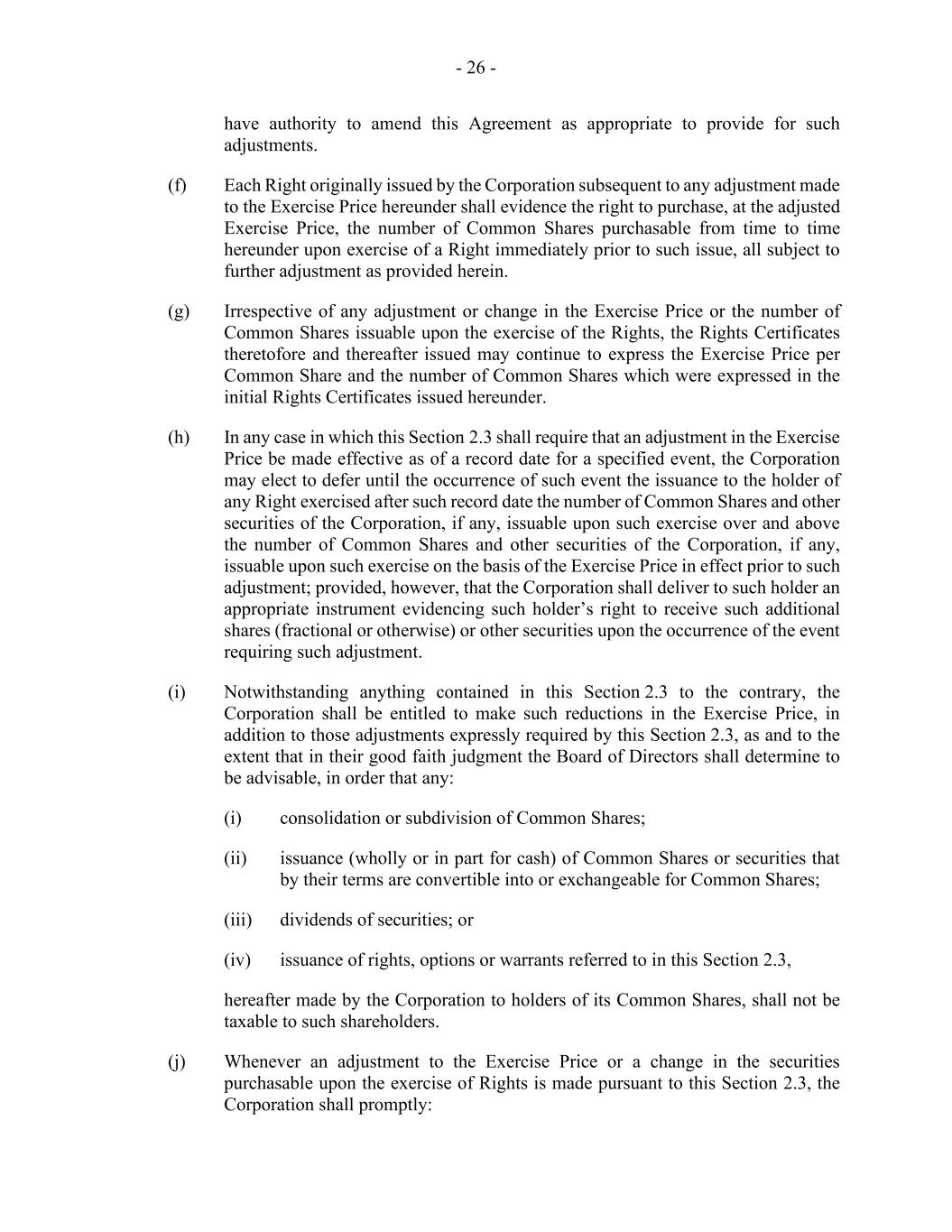 - 26 - have authority to amend this Agreement as appropriate to provide for such adjustments. (f) Each Right originally issued by the Corporation subsequent to any adjustment made to the Exercise Price hereunder shall evidence the right to purchase, at the adjusted Exercise Price, the number of Common Shares purchasable from time to time hereunder upon exercise of a Right immediately prior to such issue, all subject to further adjustment as provided herein. (g) Irrespective of any adjustment or change in the Exercise Price or the number of Common Shares issuable upon the exercise of the Rights, the Rights Certificates theretofore and thereafter issued may continue to express the Exercise Price per Common Share and the number of Common Shares which were expressed in the initial Rights Certificates issued hereunder. (h) In any case in which this Section 2.3 shall require that an adjustment in the Exercise Price be made effective as of a record date for a specified event, the Corporation may elect to defer until the occurrence of such event the issuance to the holder of any Right exercised after such record date the number of Common Shares and other securities of the Corporation, if any, issuable upon such exercise over and above the number of Common Shares and other securities of the Corporation, if any, issuable upon such exercise on the basis of the Exercise Price in effect prior to such adjustment; provided, however, that the Corporation shall deliver to such holder an appropriate instrument evidencing such holder’s right to receive such additional shares (fractional or otherwise) or other securities upon the occurrence of the event requiring such adjustment. (i) Notwithstanding anything contained in this Section 2.3 to the contrary, the Corporation shall be entitled to make such reductions in the Exercise Price, in addition to those adjustments expressly required by this Section 2.3, as and to the extent that in their good faith judgment the Board of Directors shall determine to be advisable, in order that any: (i) consolidation or subdivision of Common Shares; (ii) issuance (wholly or in part for cash) of Common Shares or securities that by their terms are convertible into or exchangeable for Common Shares; (iii) dividends of securities; or (iv) issuance of rights, options or warrants referred to in this Section 2.3, hereafter made by the Corporation to holders of its Common Shares, shall not be taxable to such shareholders. (j) Whenever an adjustment to the Exercise Price or a change in the securities purchasable upon the exercise of Rights is made pursuant to this Section 2.3, the Corporation shall promptly: