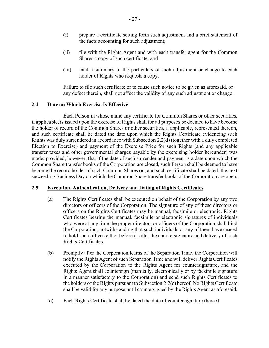 - 27 - (i) prepare a certificate setting forth such adjustment and a brief statement of the facts accounting for such adjustment; (ii) file with the Rights Agent and with each transfer agent for the Common Shares a copy of such certificate; and (iii) mail a summary of the particulars of such adjustment or change to each holder of Rights who requests a copy. Failure to file such certificate or to cause such notice to be given as aforesaid, or any defect therein, shall not affect the validity of any such adjustment or change. 2.4 Date on Which Exercise Is Effective Each Person in whose name any certificate for Common Shares or other securities, if applicable, is issued upon the exercise of Rights shall for all purposes be deemed to have become the holder of record of the Common Shares or other securities, if applicable, represented thereon, and such certificate shall be dated the date upon which the Rights Certificate evidencing such Rights was duly surrendered in accordance with Subsection 2.2(d) (together with a duly completed Election to Exercise) and payment of the Exercise Price for such Rights (and any applicable transfer taxes and other governmental charges payable by the exercising holder hereunder) was made; provided, however, that if the date of such surrender and payment is a date upon which the Common Share transfer books of the Corporation are closed, such Person shall be deemed to have become the record holder of such Common Shares on, and such certificate shall be dated, the next succeeding Business Day on which the Common Share transfer books of the Corporation are open. 2.5 Execution, Authentication, Delivery and Dating of Rights Certificates (a) The Rights Certificates shall be executed on behalf of the Corporation by any two directors or officers of the Corporation. The signature of any of these directors or officers on the Rights Certificates may be manual, facsimile or electronic. Rights Certificates bearing the manual, facsimile or electronic signatures of individuals who were at any time the proper directors or officers of the Corporation shall bind the Corporation, notwithstanding that such individuals or any of them have ceased to hold such offices either before or after the countersignature and delivery of such Rights Certificates. (b) Promptly after the Corporation learns of the Separation Time, the Corporation will notify the Rights Agent of such Separation Time and will deliver Rights Certificates executed by the Corporation to the Rights Agent for countersignature, and the Rights Agent shall countersign (manually, electronically or by facsimile signature in a manner satisfactory to the Corporation) and send such Rights Certificates to the holders of the Rights pursuant to Subsection 2.2(c) hereof. No Rights Certificate shall be valid for any purpose until countersigned by the Rights Agent as aforesaid. (c) Each Rights Certificate shall be dated the date of countersignature thereof.