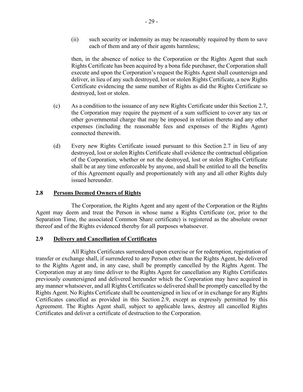 - 29 - (ii) such security or indemnity as may be reasonably required by them to save each of them and any of their agents harmless; then, in the absence of notice to the Corporation or the Rights Agent that such Rights Certificate has been acquired by a bona fide purchaser, the Corporation shall execute and upon the Corporation’s request the Rights Agent shall countersign and deliver, in lieu of any such destroyed, lost or stolen Rights Certificate, a new Rights Certificate evidencing the same number of Rights as did the Rights Certificate so destroyed, lost or stolen. (c) As a condition to the issuance of any new Rights Certificate under this Section 2.7, the Corporation may require the payment of a sum sufficient to cover any tax or other governmental charge that may be imposed in relation thereto and any other expenses (including the reasonable fees and expenses of the Rights Agent) connected therewith. (d) Every new Rights Certificate issued pursuant to this Section 2.7 in lieu of any destroyed, lost or stolen Rights Certificate shall evidence the contractual obligation of the Corporation, whether or not the destroyed, lost or stolen Rights Certificate shall be at any time enforceable by anyone, and shall be entitled to all the benefits of this Agreement equally and proportionately with any and all other Rights duly issued hereunder. 2.8 Persons Deemed Owners of Rights The Corporation, the Rights Agent and any agent of the Corporation or the Rights Agent may deem and treat the Person in whose name a Rights Certificate (or, prior to the Separation Time, the associated Common Share certificate) is registered as the absolute owner thereof and of the Rights evidenced thereby for all purposes whatsoever. 2.9 Delivery and Cancellation of Certificates All Rights Certificates surrendered upon exercise or for redemption, registration of transfer or exchange shall, if surrendered to any Person other than the Rights Agent, be delivered to the Rights Agent and, in any case, shall be promptly cancelled by the Rights Agent. The Corporation may at any time deliver to the Rights Agent for cancellation any Rights Certificates previously countersigned and delivered hereunder which the Corporation may have acquired in any manner whatsoever, and all Rights Certificates so delivered shall be promptly cancelled by the Rights Agent. No Rights Certificate shall be countersigned in lieu of or in exchange for any Rights Certificates cancelled as provided in this Section 2.9, except as expressly permitted by this Agreement. The Rights Agent shall, subject to applicable laws, destroy all cancelled Rights Certificates and deliver a certificate of destruction to the Corporation.