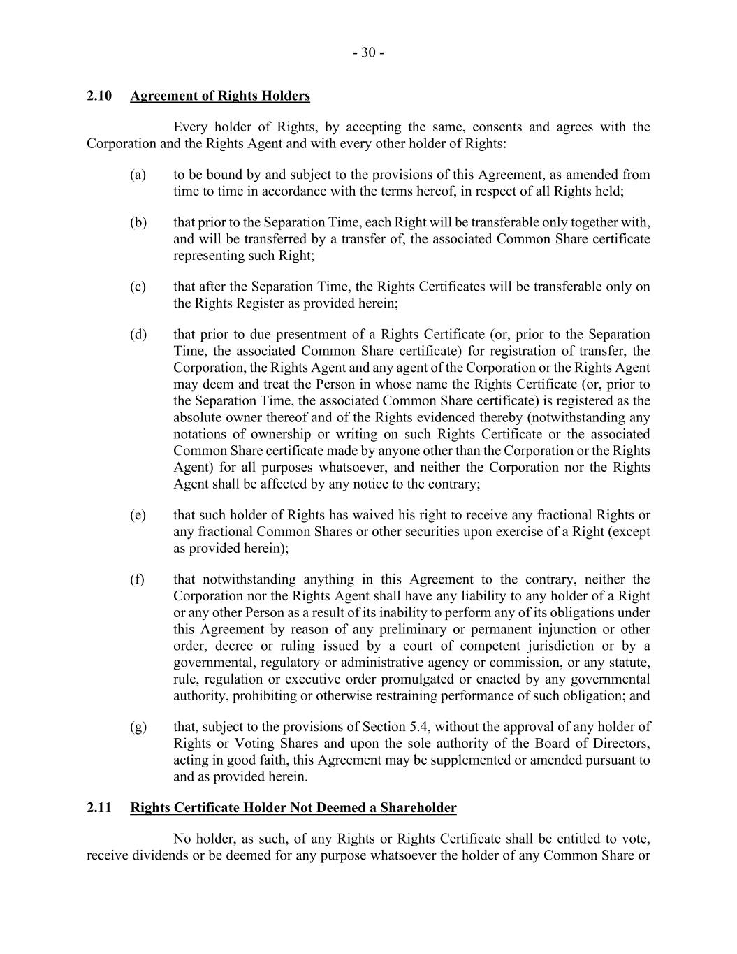 - 30 - 2.10 Agreement of Rights Holders Every holder of Rights, by accepting the same, consents and agrees with the Corporation and the Rights Agent and with every other holder of Rights: (a) to be bound by and subject to the provisions of this Agreement, as amended from time to time in accordance with the terms hereof, in respect of all Rights held; (b) that prior to the Separation Time, each Right will be transferable only together with, and will be transferred by a transfer of, the associated Common Share certificate representing such Right; (c) that after the Separation Time, the Rights Certificates will be transferable only on the Rights Register as provided herein; (d) that prior to due presentment of a Rights Certificate (or, prior to the Separation Time, the associated Common Share certificate) for registration of transfer, the Corporation, the Rights Agent and any agent of the Corporation or the Rights Agent may deem and treat the Person in whose name the Rights Certificate (or, prior to the Separation Time, the associated Common Share certificate) is registered as the absolute owner thereof and of the Rights evidenced thereby (notwithstanding any notations of ownership or writing on such Rights Certificate or the associated Common Share certificate made by anyone other than the Corporation or the Rights Agent) for all purposes whatsoever, and neither the Corporation nor the Rights Agent shall be affected by any notice to the contrary; (e) that such holder of Rights has waived his right to receive any fractional Rights or any fractional Common Shares or other securities upon exercise of a Right (except as provided herein); (f) that notwithstanding anything in this Agreement to the contrary, neither the Corporation nor the Rights Agent shall have any liability to any holder of a Right or any other Person as a result of its inability to perform any of its obligations under this Agreement by reason of any preliminary or permanent injunction or other order, decree or ruling issued by a court of competent jurisdiction or by a governmental, regulatory or administrative agency or commission, or any statute, rule, regulation or executive order promulgated or enacted by any governmental authority, prohibiting or otherwise restraining performance of such obligation; and (g) that, subject to the provisions of Section 5.4, without the approval of any holder of Rights or Voting Shares and upon the sole authority of the Board of Directors, acting in good faith, this Agreement may be supplemented or amended pursuant to and as provided herein. 2.11 Rights Certificate Holder Not Deemed a Shareholder No holder, as such, of any Rights or Rights Certificate shall be entitled to vote, receive dividends or be deemed for any purpose whatsoever the holder of any Common Share or