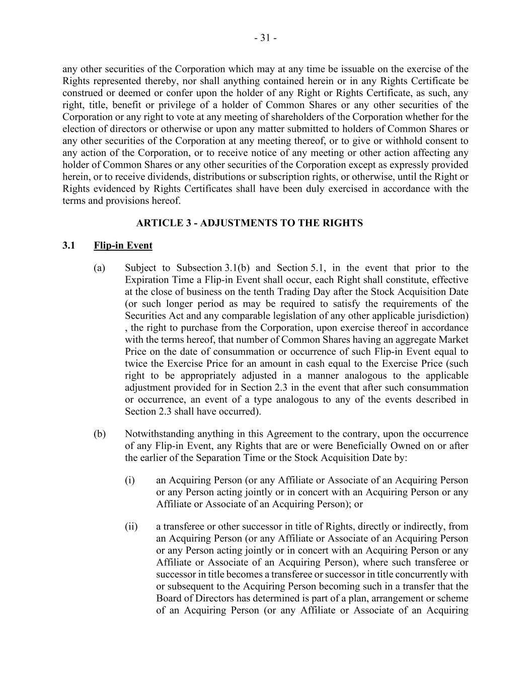 - 31 - any other securities of the Corporation which may at any time be issuable on the exercise of the Rights represented thereby, nor shall anything contained herein or in any Rights Certificate be construed or deemed or confer upon the holder of any Right or Rights Certificate, as such, any right, title, benefit or privilege of a holder of Common Shares or any other securities of the Corporation or any right to vote at any meeting of shareholders of the Corporation whether for the election of directors or otherwise or upon any matter submitted to holders of Common Shares or any other securities of the Corporation at any meeting thereof, or to give or withhold consent to any action of the Corporation, or to receive notice of any meeting or other action affecting any holder of Common Shares or any other securities of the Corporation except as expressly provided herein, or to receive dividends, distributions or subscription rights, or otherwise, until the Right or Rights evidenced by Rights Certificates shall have been duly exercised in accordance with the terms and provisions hereof. ARTICLE 3 - ADJUSTMENTS TO THE RIGHTS 3.1 Flip-in Event (a) Subject to Subsection 3.1(b) and Section 5.1, in the event that prior to the Expiration Time a Flip-in Event shall occur, each Right shall constitute, effective at the close of business on the tenth Trading Day after the Stock Acquisition Date (or such longer period as may be required to satisfy the requirements of the Securities Act and any comparable legislation of any other applicable jurisdiction) , the right to purchase from the Corporation, upon exercise thereof in accordance with the terms hereof, that number of Common Shares having an aggregate Market Price on the date of consummation or occurrence of such Flip-in Event equal to twice the Exercise Price for an amount in cash equal to the Exercise Price (such right to be appropriately adjusted in a manner analogous to the applicable adjustment provided for in Section 2.3 in the event that after such consummation or occurrence, an event of a type analogous to any of the events described in Section 2.3 shall have occurred). (b) Notwithstanding anything in this Agreement to the contrary, upon the occurrence of any Flip-in Event, any Rights that are or were Beneficially Owned on or after the earlier of the Separation Time or the Stock Acquisition Date by: (i) an Acquiring Person (or any Affiliate or Associate of an Acquiring Person or any Person acting jointly or in concert with an Acquiring Person or any Affiliate or Associate of an Acquiring Person); or (ii) a transferee or other successor in title of Rights, directly or indirectly, from an Acquiring Person (or any Affiliate or Associate of an Acquiring Person or any Person acting jointly or in concert with an Acquiring Person or any Affiliate or Associate of an Acquiring Person), where such transferee or successor in title becomes a transferee or successor in title concurrently with or subsequent to the Acquiring Person becoming such in a transfer that the Board of Directors has determined is part of a plan, arrangement or scheme of an Acquiring Person (or any Affiliate or Associate of an Acquiring