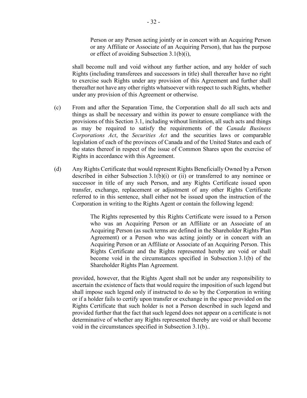 - 32 - Person or any Person acting jointly or in concert with an Acquiring Person or any Affiliate or Associate of an Acquiring Person), that has the purpose or effect of avoiding Subsection 3.1(b)(i), shall become null and void without any further action, and any holder of such Rights (including transferees and successors in title) shall thereafter have no right to exercise such Rights under any provision of this Agreement and further shall thereafter not have any other rights whatsoever with respect to such Rights, whether under any provision of this Agreement or otherwise. (c) From and after the Separation Time, the Corporation shall do all such acts and things as shall be necessary and within its power to ensure compliance with the provisions of this Section 3.1, including without limitation, all such acts and things as may be required to satisfy the requirements of the Canada Business Corporations Act, the Securities Act and the securities laws or comparable legislation of each of the provinces of Canada and of the United States and each of the states thereof in respect of the issue of Common Shares upon the exercise of Rights in accordance with this Agreement. (d) Any Rights Certificate that would represent Rights Beneficially Owned by a Person described in either Subsection 3.1(b)(i) or (ii) or transferred to any nominee or successor in title of any such Person, and any Rights Certificate issued upon transfer, exchange, replacement or adjustment of any other Rights Certificate referred to in this sentence, shall either not be issued upon the instruction of the Corporation in writing to the Rights Agent or contain the following legend: The Rights represented by this Rights Certificate were issued to a Person who was an Acquiring Person or an Affiliate or an Associate of an Acquiring Person (as such terms are defined in the Shareholder Rights Plan Agreement) or a Person who was acting jointly or in concert with an Acquiring Person or an Affiliate or Associate of an Acquiring Person. This Rights Certificate and the Rights represented hereby are void or shall become void in the circumstances specified in Subsection 3.1(b) of the Shareholder Rights Plan Agreement. provided, however, that the Rights Agent shall not be under any responsibility to ascertain the existence of facts that would require the imposition of such legend but shall impose such legend only if instructed to do so by the Corporation in writing or if a holder fails to certify upon transfer or exchange in the space provided on the Rights Certificate that such holder is not a Person described in such legend and provided further that the fact that such legend does not appear on a certificate is not determinative of whether any Rights represented thereby are void or shall become void in the circumstances specified in Subsection 3.1(b)..