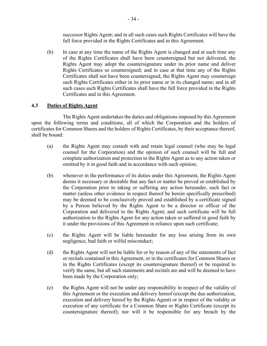 - 34 - successor Rights Agent; and in all such cases such Rights Certificates will have the full force provided in the Rights Certificates and in this Agreement. (b) In case at any time the name of the Rights Agent is changed and at such time any of the Rights Certificates shall have been countersigned but not delivered, the Rights Agent may adopt the countersignature under its prior name and deliver Rights Certificates so countersigned; and in case at that time any of the Rights Certificates shall not have been countersigned, the Rights Agent may countersign such Rights Certificates either in its prior name or in its changed name; and in all such cases such Rights Certificates shall have the full force provided in the Rights Certificates and in this Agreement. 4.3 Duties of Rights Agent The Rights Agent undertakes the duties and obligations imposed by this Agreement upon the following terms and conditions, all of which the Corporation and the holders of certificates for Common Shares and the holders of Rights Certificates, by their acceptance thereof, shall be bound: (a) the Rights Agent may consult with and retain legal counsel (who may be legal counsel for the Corporation) and the opinion of such counsel will be full and complete authorization and protection to the Rights Agent as to any action taken or omitted by it in good faith and in accordance with such opinion; (b) whenever in the performance of its duties under this Agreement, the Rights Agent deems it necessary or desirable that any fact or matter be proved or established by the Corporation prior to taking or suffering any action hereunder, such fact or matter (unless other evidence in respect thereof be herein specifically prescribed) may be deemed to be conclusively proved and established by a certificate signed by a Person believed by the Rights Agent to be a director or officer of the Corporation and delivered to the Rights Agent; and such certificate will be full authorization to the Rights Agent for any action taken or suffered in good faith by it under the provisions of this Agreement in reliance upon such certificate; (c) the Rights Agent will be liable hereunder for any loss arising from its own negligence, bad faith or wilful misconduct; (d) the Rights Agent will not be liable for or by reason of any of the statements of fact or recitals contained in this Agreement, or in the certificates for Common Shares or in the Rights Certificates (except its countersignature thereof) or be required to verify the same, but all such statements and recitals are and will be deemed to have been made by the Corporation only; (e) the Rights Agent will not be under any responsibility in respect of the validity of this Agreement or the execution and delivery hereof (except the due authorization, execution and delivery hereof by the Rights Agent) or in respect of the validity or execution of any certificate for a Common Share or Rights Certificate (except its countersignature thereof); nor will it be responsible for any breach by the