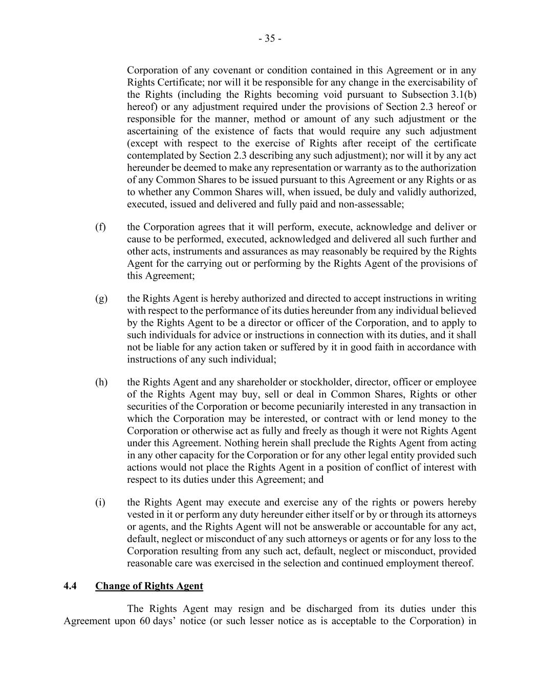 - 35 - Corporation of any covenant or condition contained in this Agreement or in any Rights Certificate; nor will it be responsible for any change in the exercisability of the Rights (including the Rights becoming void pursuant to Subsection 3.1(b) hereof) or any adjustment required under the provisions of Section 2.3 hereof or responsible for the manner, method or amount of any such adjustment or the ascertaining of the existence of facts that would require any such adjustment (except with respect to the exercise of Rights after receipt of the certificate contemplated by Section 2.3 describing any such adjustment); nor will it by any act hereunder be deemed to make any representation or warranty as to the authorization of any Common Shares to be issued pursuant to this Agreement or any Rights or as to whether any Common Shares will, when issued, be duly and validly authorized, executed, issued and delivered and fully paid and non-assessable; (f) the Corporation agrees that it will perform, execute, acknowledge and deliver or cause to be performed, executed, acknowledged and delivered all such further and other acts, instruments and assurances as may reasonably be required by the Rights Agent for the carrying out or performing by the Rights Agent of the provisions of this Agreement; (g) the Rights Agent is hereby authorized and directed to accept instructions in writing with respect to the performance of its duties hereunder from any individual believed by the Rights Agent to be a director or officer of the Corporation, and to apply to such individuals for advice or instructions in connection with its duties, and it shall not be liable for any action taken or suffered by it in good faith in accordance with instructions of any such individual; (h) the Rights Agent and any shareholder or stockholder, director, officer or employee of the Rights Agent may buy, sell or deal in Common Shares, Rights or other securities of the Corporation or become pecuniarily interested in any transaction in which the Corporation may be interested, or contract with or lend money to the Corporation or otherwise act as fully and freely as though it were not Rights Agent under this Agreement. Nothing herein shall preclude the Rights Agent from acting in any other capacity for the Corporation or for any other legal entity provided such actions would not place the Rights Agent in a position of conflict of interest with respect to its duties under this Agreement; and (i) the Rights Agent may execute and exercise any of the rights or powers hereby vested in it or perform any duty hereunder either itself or by or through its attorneys or agents, and the Rights Agent will not be answerable or accountable for any act, default, neglect or misconduct of any such attorneys or agents or for any loss to the Corporation resulting from any such act, default, neglect or misconduct, provided reasonable care was exercised in the selection and continued employment thereof. 4.4 Change of Rights Agent The Rights Agent may resign and be discharged from its duties under this Agreement upon 60 days’ notice (or such lesser notice as is acceptable to the Corporation) in