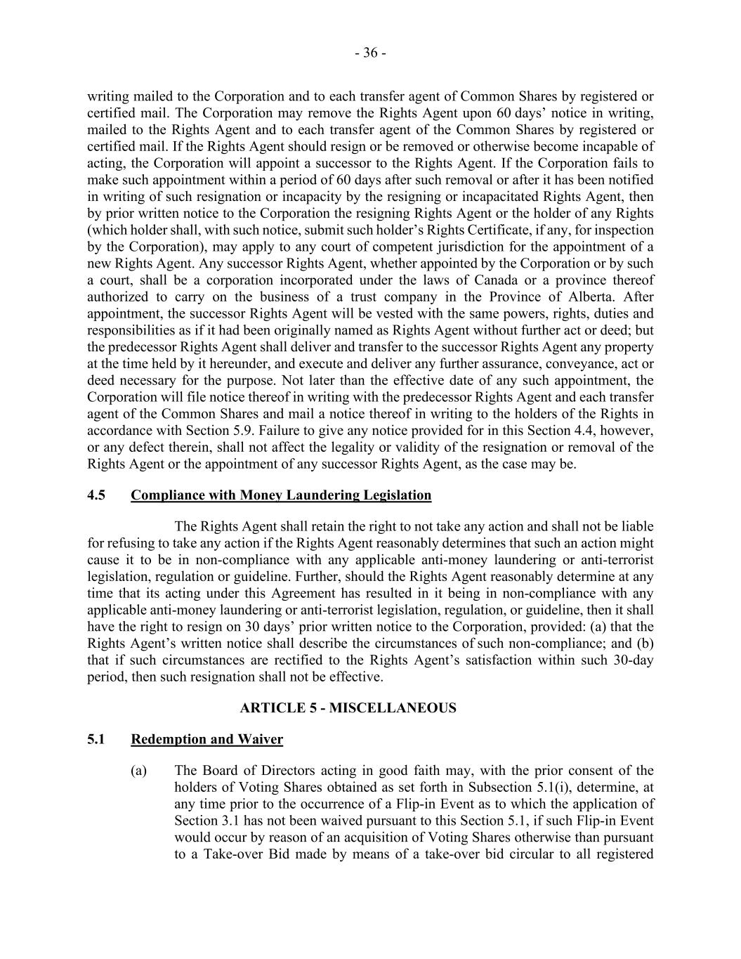 - 36 - writing mailed to the Corporation and to each transfer agent of Common Shares by registered or certified mail. The Corporation may remove the Rights Agent upon 60 days’ notice in writing, mailed to the Rights Agent and to each transfer agent of the Common Shares by registered or certified mail. If the Rights Agent should resign or be removed or otherwise become incapable of acting, the Corporation will appoint a successor to the Rights Agent. If the Corporation fails to make such appointment within a period of 60 days after such removal or after it has been notified in writing of such resignation or incapacity by the resigning or incapacitated Rights Agent, then by prior written notice to the Corporation the resigning Rights Agent or the holder of any Rights (which holder shall, with such notice, submit such holder’s Rights Certificate, if any, for inspection by the Corporation), may apply to any court of competent jurisdiction for the appointment of a new Rights Agent. Any successor Rights Agent, whether appointed by the Corporation or by such a court, shall be a corporation incorporated under the laws of Canada or a province thereof authorized to carry on the business of a trust company in the Province of Alberta. After appointment, the successor Rights Agent will be vested with the same powers, rights, duties and responsibilities as if it had been originally named as Rights Agent without further act or deed; but the predecessor Rights Agent shall deliver and transfer to the successor Rights Agent any property at the time held by it hereunder, and execute and deliver any further assurance, conveyance, act or deed necessary for the purpose. Not later than the effective date of any such appointment, the Corporation will file notice thereof in writing with the predecessor Rights Agent and each transfer agent of the Common Shares and mail a notice thereof in writing to the holders of the Rights in accordance with Section 5.9. Failure to give any notice provided for in this Section 4.4, however, or any defect therein, shall not affect the legality or validity of the resignation or removal of the Rights Agent or the appointment of any successor Rights Agent, as the case may be. 4.5 Compliance with Money Laundering Legislation The Rights Agent shall retain the right to not take any action and shall not be liable for refusing to take any action if the Rights Agent reasonably determines that such an action might cause it to be in non-compliance with any applicable anti-money laundering or anti-terrorist legislation, regulation or guideline. Further, should the Rights Agent reasonably determine at any time that its acting under this Agreement has resulted in it being in non-compliance with any applicable anti-money laundering or anti-terrorist legislation, regulation, or guideline, then it shall have the right to resign on 30 days’ prior written notice to the Corporation, provided: (a) that the Rights Agent’s written notice shall describe the circumstances of such non-compliance; and (b) that if such circumstances are rectified to the Rights Agent’s satisfaction within such 30-day period, then such resignation shall not be effective. ARTICLE 5 - MISCELLANEOUS 5.1 Redemption and Waiver (a) The Board of Directors acting in good faith may, with the prior consent of the holders of Voting Shares obtained as set forth in Subsection 5.1(i), determine, at any time prior to the occurrence of a Flip-in Event as to which the application of Section 3.1 has not been waived pursuant to this Section 5.1, if such Flip-in Event would occur by reason of an acquisition of Voting Shares otherwise than pursuant to a Take-over Bid made by means of a take-over bid circular to all registered