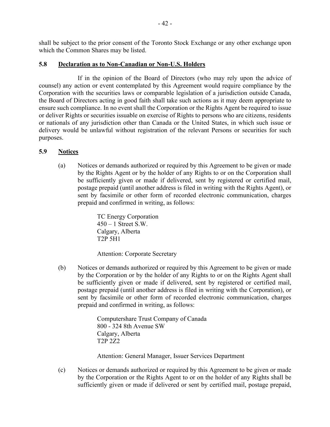 - 42 - shall be subject to the prior consent of the Toronto Stock Exchange or any other exchange upon which the Common Shares may be listed. 5.8 Declaration as to Non-Canadian or Non-U.S. Holders If in the opinion of the Board of Directors (who may rely upon the advice of counsel) any action or event contemplated by this Agreement would require compliance by the Corporation with the securities laws or comparable legislation of a jurisdiction outside Canada, the Board of Directors acting in good faith shall take such actions as it may deem appropriate to ensure such compliance. In no event shall the Corporation or the Rights Agent be required to issue or deliver Rights or securities issuable on exercise of Rights to persons who are citizens, residents or nationals of any jurisdiction other than Canada or the United States, in which such issue or delivery would be unlawful without registration of the relevant Persons or securities for such purposes. 5.9 Notices (a) Notices or demands authorized or required by this Agreement to be given or made by the Rights Agent or by the holder of any Rights to or on the Corporation shall be sufficiently given or made if delivered, sent by registered or certified mail, postage prepaid (until another address is filed in writing with the Rights Agent), or sent by facsimile or other form of recorded electronic communication, charges prepaid and confirmed in writing, as follows: TC Energy Corporation 450 – 1 Street S.W. Calgary, Alberta T2P 5H1 Attention: Corporate Secretary (b) Notices or demands authorized or required by this Agreement to be given or made by the Corporation or by the holder of any Rights to or on the Rights Agent shall be sufficiently given or made if delivered, sent by registered or certified mail, postage prepaid (until another address is filed in writing with the Corporation), or sent by facsimile or other form of recorded electronic communication, charges prepaid and confirmed in writing, as follows: Computershare Trust Company of Canada 800 - 324 8th Avenue SW Calgary, Alberta T2P 2Z2 Attention: General Manager, Issuer Services Department (c) Notices or demands authorized or required by this Agreement to be given or made by the Corporation or the Rights Agent to or on the holder of any Rights shall be sufficiently given or made if delivered or sent by certified mail, postage prepaid,