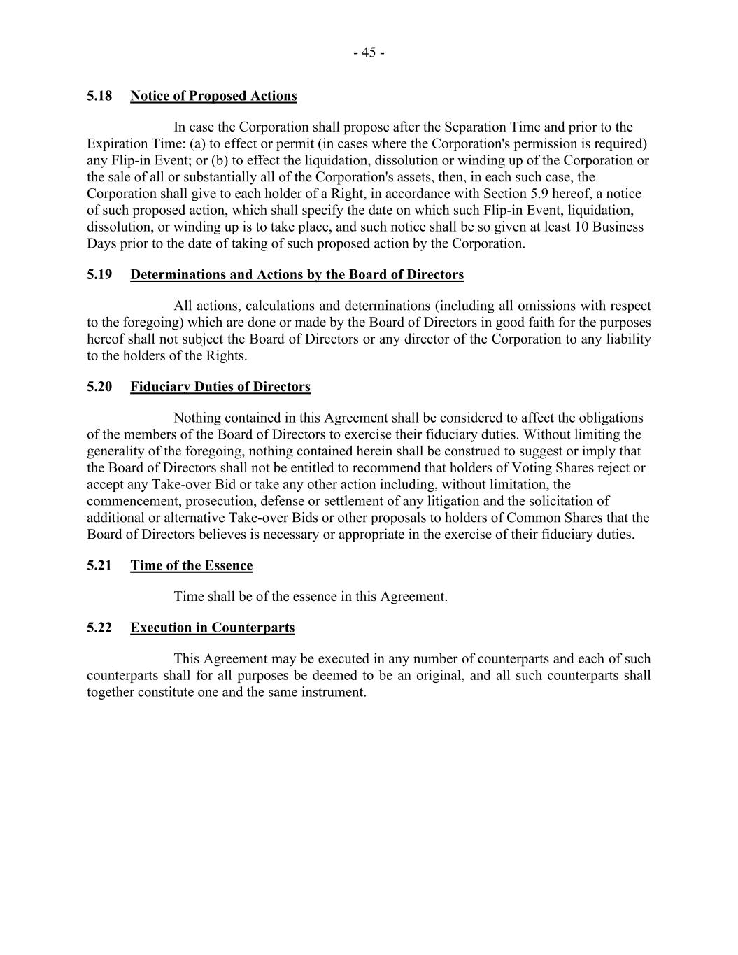 - 45 - 5.18 Notice of Proposed Actions In case the Corporation shall propose after the Separation Time and prior to the Expiration Time: (a) to effect or permit (in cases where the Corporation's permission is required) any Flip-in Event; or (b) to effect the liquidation, dissolution or winding up of the Corporation or the sale of all or substantially all of the Corporation's assets, then, in each such case, the Corporation shall give to each holder of a Right, in accordance with Section 5.9 hereof, a notice of such proposed action, which shall specify the date on which such Flip-in Event, liquidation, dissolution, or winding up is to take place, and such notice shall be so given at least 10 Business Days prior to the date of taking of such proposed action by the Corporation. 5.19 Determinations and Actions by the Board of Directors All actions, calculations and determinations (including all omissions with respect to the foregoing) which are done or made by the Board of Directors in good faith for the purposes hereof shall not subject the Board of Directors or any director of the Corporation to any liability to the holders of the Rights. 5.20 Fiduciary Duties of Directors Nothing contained in this Agreement shall be considered to affect the obligations of the members of the Board of Directors to exercise their fiduciary duties. Without limiting the generality of the foregoing, nothing contained herein shall be construed to suggest or imply that the Board of Directors shall not be entitled to recommend that holders of Voting Shares reject or accept any Take-over Bid or take any other action including, without limitation, the commencement, prosecution, defense or settlement of any litigation and the solicitation of additional or alternative Take-over Bids or other proposals to holders of Common Shares that the Board of Directors believes is necessary or appropriate in the exercise of their fiduciary duties. 5.21 Time of the Essence Time shall be of the essence in this Agreement. 5.22 Execution in Counterparts This Agreement may be executed in any number of counterparts and each of such counterparts shall for all purposes be deemed to be an original, and all such counterparts shall together constitute one and the same instrument.