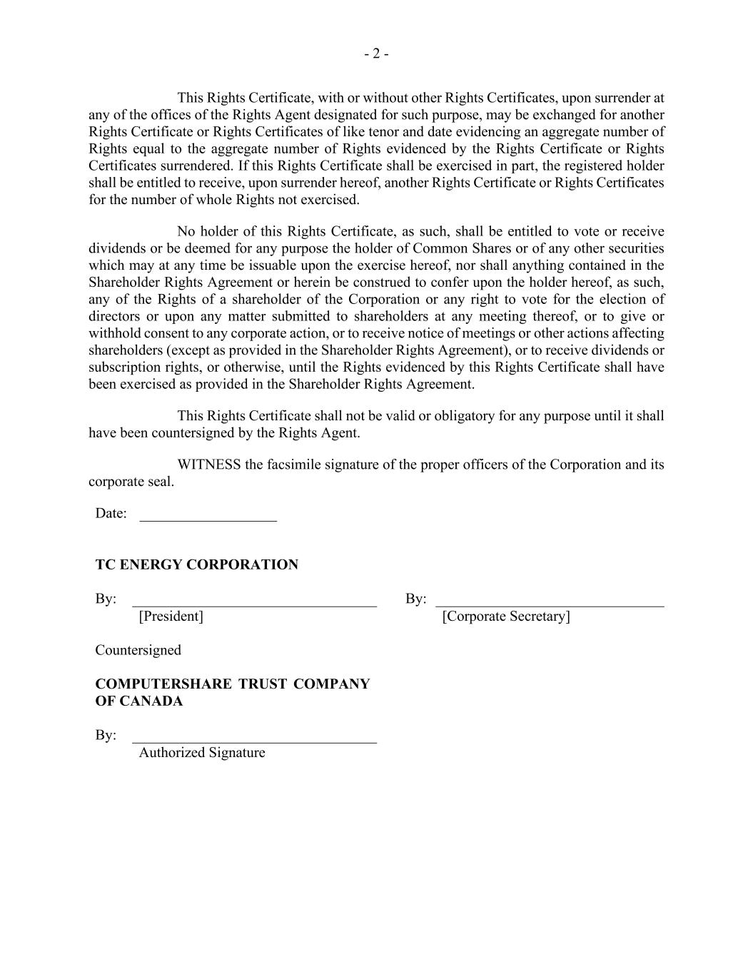 - 2 - This Rights Certificate, with or without other Rights Certificates, upon surrender at any of the offices of the Rights Agent designated for such purpose, may be exchanged for another Rights Certificate or Rights Certificates of like tenor and date evidencing an aggregate number of Rights equal to the aggregate number of Rights evidenced by the Rights Certificate or Rights Certificates surrendered. If this Rights Certificate shall be exercised in part, the registered holder shall be entitled to receive, upon surrender hereof, another Rights Certificate or Rights Certificates for the number of whole Rights not exercised. No holder of this Rights Certificate, as such, shall be entitled to vote or receive dividends or be deemed for any purpose the holder of Common Shares or of any other securities which may at any time be issuable upon the exercise hereof, nor shall anything contained in the Shareholder Rights Agreement or herein be construed to confer upon the holder hereof, as such, any of the Rights of a shareholder of the Corporation or any right to vote for the election of directors or upon any matter submitted to shareholders at any meeting thereof, or to give or withhold consent to any corporate action, or to receive notice of meetings or other actions affecting shareholders (except as provided in the Shareholder Rights Agreement), or to receive dividends or subscription rights, or otherwise, until the Rights evidenced by this Rights Certificate shall have been exercised as provided in the Shareholder Rights Agreement. This Rights Certificate shall not be valid or obligatory for any purpose until it shall have been countersigned by the Rights Agent. WITNESS the facsimile signature of the proper officers of the Corporation and its corporate seal. Date: TC ENERGY CORPORATION By: By: [President] [Corporate Secretary] Countersigned COMPUTERSHARE TRUST COMPANY OF CANADA By: Authorized Signature