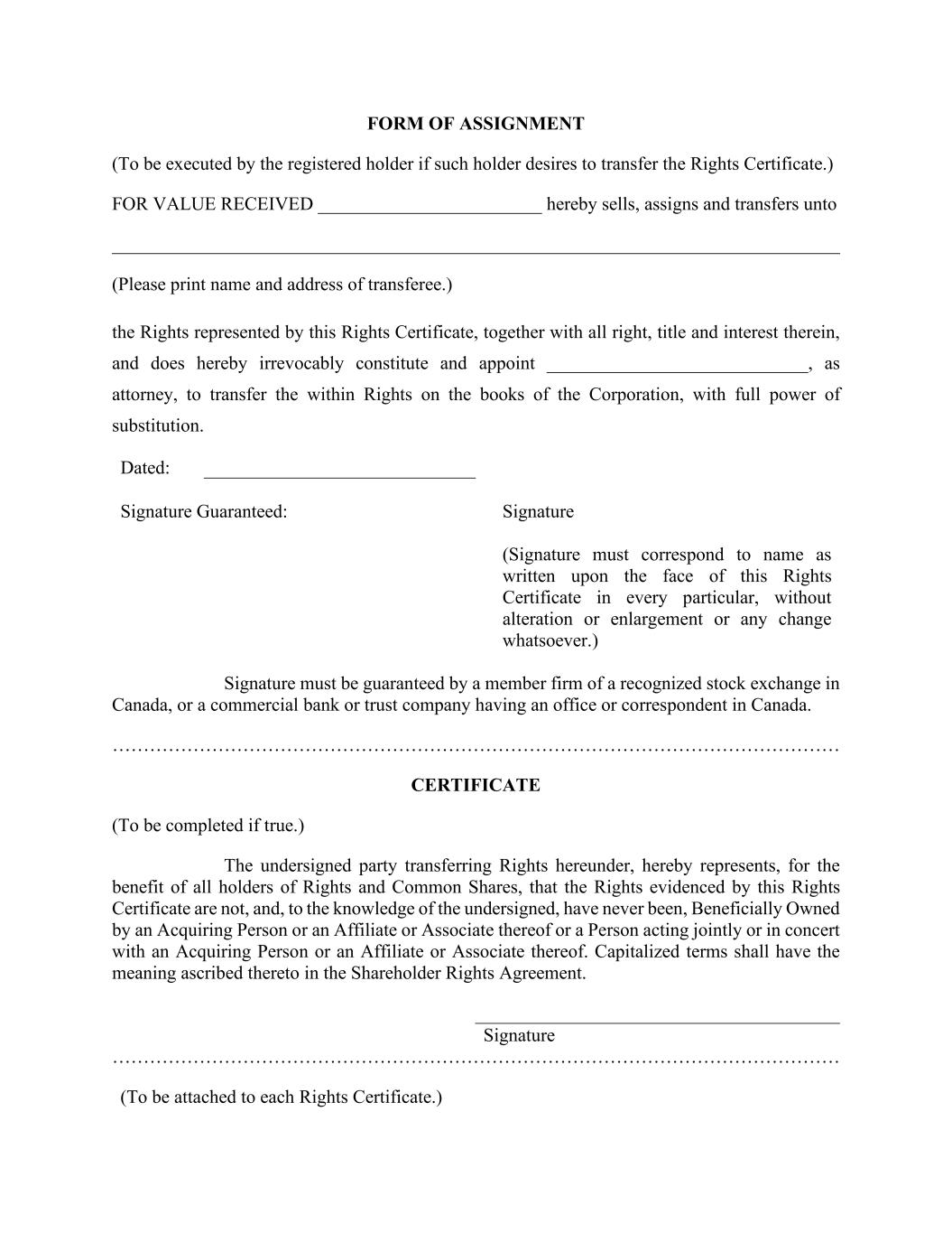 FORM OF ASSIGNMENT (To be executed by the registered holder if such holder desires to transfer the Rights Certificate.) FOR VALUE RECEIVED ________________________ hereby sells, assigns and transfers unto ______________________________________________________________________________ (Please print name and address of transferee.) the Rights represented by this Rights Certificate, together with all right, title and interest therein, and does hereby irrevocably constitute and appoint ____________________________, as attorney, to transfer the within Rights on the books of the Corporation, with full power of substitution. Dated: Signature Guaranteed: Signature (Signature must correspond to name as written upon the face of this Rights Certificate in every particular, without alteration or enlargement or any change whatsoever.) Signature must be guaranteed by a member firm of a recognized stock exchange in Canada, or a commercial bank or trust company having an office or correspondent in Canada. ……………………………………………………………………………………………………… CERTIFICATE (To be completed if true.) The undersigned party transferring Rights hereunder, hereby represents, for the benefit of all holders of Rights and Common Shares, that the Rights evidenced by this Rights Certificate are not, and, to the knowledge of the undersigned, have never been, Beneficially Owned by an Acquiring Person or an Affiliate or Associate thereof or a Person acting jointly or in concert with an Acquiring Person or an Affiliate or Associate thereof. Capitalized terms shall have the meaning ascribed thereto in the Shareholder Rights Agreement. Signature ……………………………………………………………………………………………………… (To be attached to each Rights Certificate.)