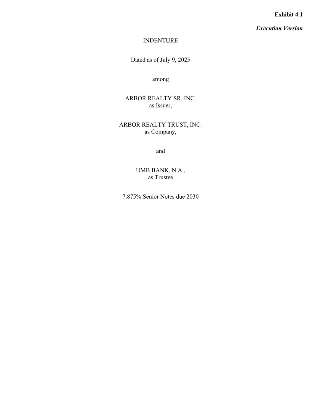 Exhibit 4.1 Execution Version INDENTURE Dated as of July 9, 2025 among ARBOR REALTY SR, INC. as Issuer, ARBOR REALTY TRUST, INC. as Company, and UMB BANK, N.A., as Trustee 7.875% Senior Notes due 2030