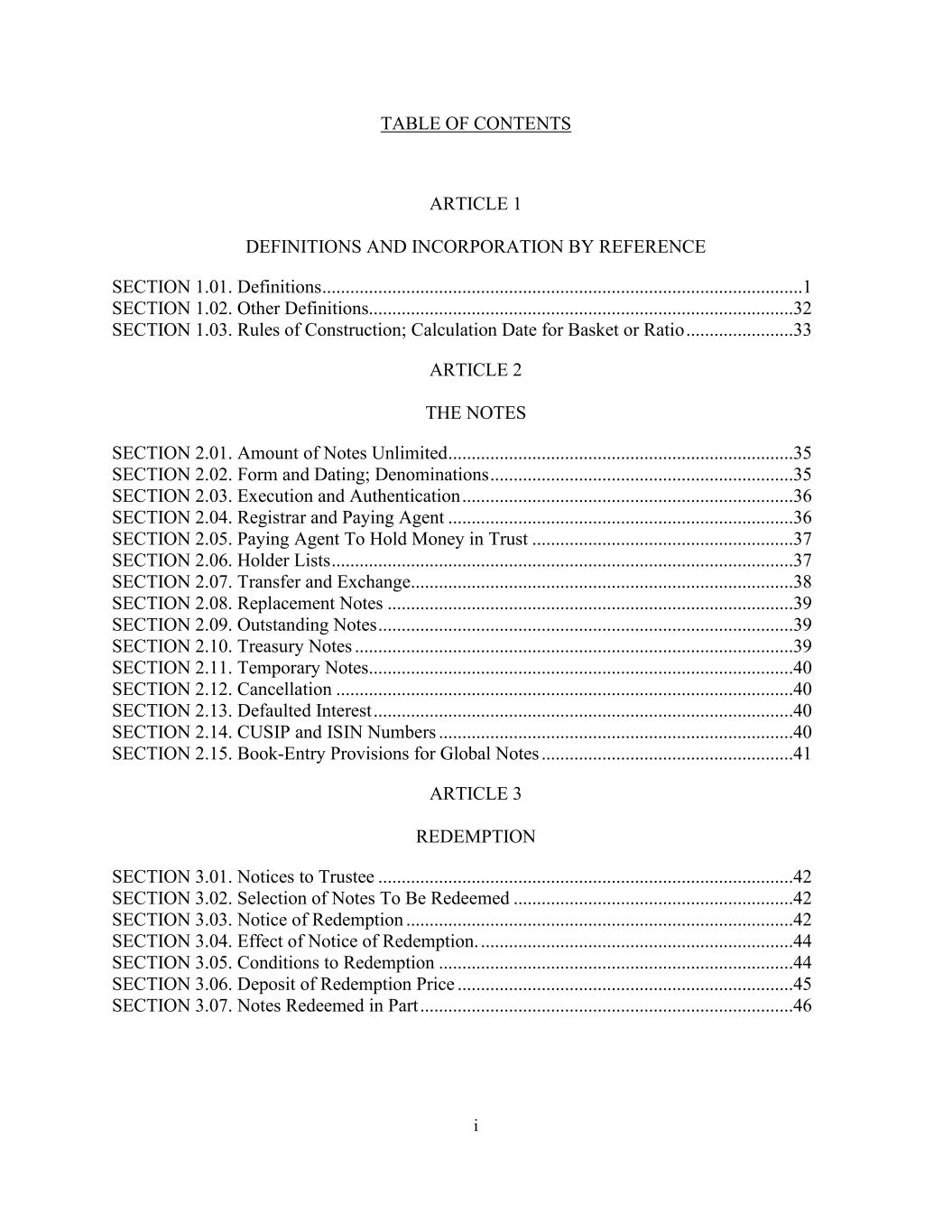i TABLE OF CONTENTS ARTICLE 1 DEFINITIONS AND INCORPORATION BY REFERENCE SECTION 1.01. Definitions .......................................................................................................1 SECTION 1.02. Other Definitions...........................................................................................32 SECTION 1.03. Rules of Construction; Calculation Date for Basket or Ratio .......................33 ARTICLE 2 THE NOTES SECTION 2.01. Amount of Notes Unlimited ..........................................................................35 SECTION 2.02. Form and Dating; Denominations .................................................................35 SECTION 2.03. Execution and Authentication .......................................................................36 SECTION 2.04. Registrar and Paying Agent ..........................................................................36 SECTION 2.05. Paying Agent To Hold Money in Trust ........................................................37 SECTION 2.06. Holder Lists ...................................................................................................37 SECTION 2.07. Transfer and Exchange..................................................................................38 SECTION 2.08. Replacement Notes .......................................................................................39 SECTION 2.09. Outstanding Notes .........................................................................................39 SECTION 2.10. Treasury Notes ..............................................................................................39 SECTION 2.11. Temporary Notes...........................................................................................40 SECTION 2.12. Cancellation ..................................................................................................40 SECTION 2.13. Defaulted Interest ..........................................................................................40 SECTION 2.14. CUSIP and ISIN Numbers ............................................................................40 SECTION 2.15. Book-Entry Provisions for Global Notes ......................................................41 ARTICLE 3 REDEMPTION SECTION 3.01. Notices to Trustee .........................................................................................42 SECTION 3.02. Selection of Notes To Be Redeemed ............................................................42 SECTION 3.03. Notice of Redemption ...................................................................................42 SECTION 3.04. Effect of Notice of Redemption. ...................................................................44 SECTION 3.05. Conditions to Redemption ............................................................................44 SECTION 3.06. Deposit of Redemption Price ........................................................................45 SECTION 3.07. Notes Redeemed in Part ................................................................................46