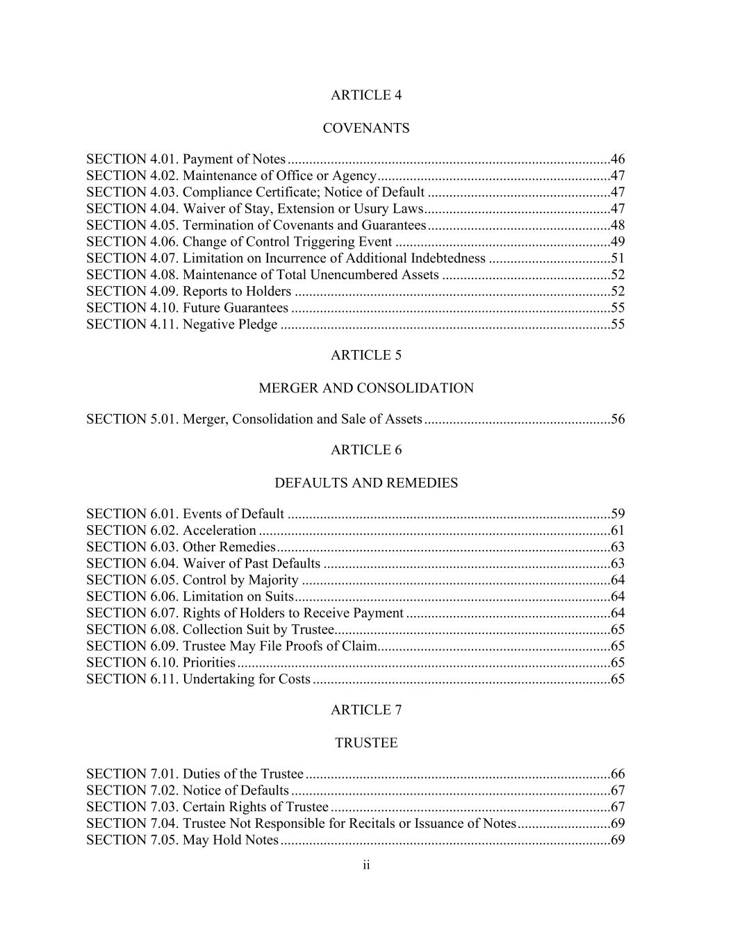 ii ARTICLE 4 COVENANTS SECTION 4.01. Payment of Notes ..........................................................................................46 SECTION 4.02. Maintenance of Office or Agency .................................................................47 SECTION 4.03. Compliance Certificate; Notice of Default ...................................................47 SECTION 4.04. Waiver of Stay, Extension or Usury Laws ....................................................47 SECTION 4.05. Termination of Covenants and Guarantees ...................................................48 SECTION 4.06. Change of Control Triggering Event ............................................................49 SECTION 4.07. Limitation on Incurrence of Additional Indebtedness ..................................51 SECTION 4.08. Maintenance of Total Unencumbered Assets ...............................................52 SECTION 4.09. Reports to Holders ........................................................................................52 SECTION 4.10. Future Guarantees .........................................................................................55 SECTION 4.11. Negative Pledge ............................................................................................55 ARTICLE 5 MERGER AND CONSOLIDATION SECTION 5.01. Merger, Consolidation and Sale of Assets ....................................................56 ARTICLE 6 DEFAULTS AND REMEDIES SECTION 6.01. Events of Default ..........................................................................................59 SECTION 6.02. Acceleration ..................................................................................................61 SECTION 6.03. Other Remedies .............................................................................................63 SECTION 6.04. Waiver of Past Defaults ................................................................................63 SECTION 6.05. Control by Majority ......................................................................................64 SECTION 6.06. Limitation on Suits ........................................................................................64 SECTION 6.07. Rights of Holders to Receive Payment .........................................................64 SECTION 6.08. Collection Suit by Trustee.............................................................................65 SECTION 6.09. Trustee May File Proofs of Claim.................................................................65 SECTION 6.10. Priorities ........................................................................................................65 SECTION 6.11. Undertaking for Costs ...................................................................................65 ARTICLE 7 TRUSTEE SECTION 7.01. Duties of the Trustee .....................................................................................66 SECTION 7.02. Notice of Defaults .........................................................................................67 SECTION 7.03. Certain Rights of Trustee ..............................................................................67 SECTION 7.04. Trustee Not Responsible for Recitals or Issuance of Notes ..........................69 SECTION 7.05. May Hold Notes ............................................................................................69